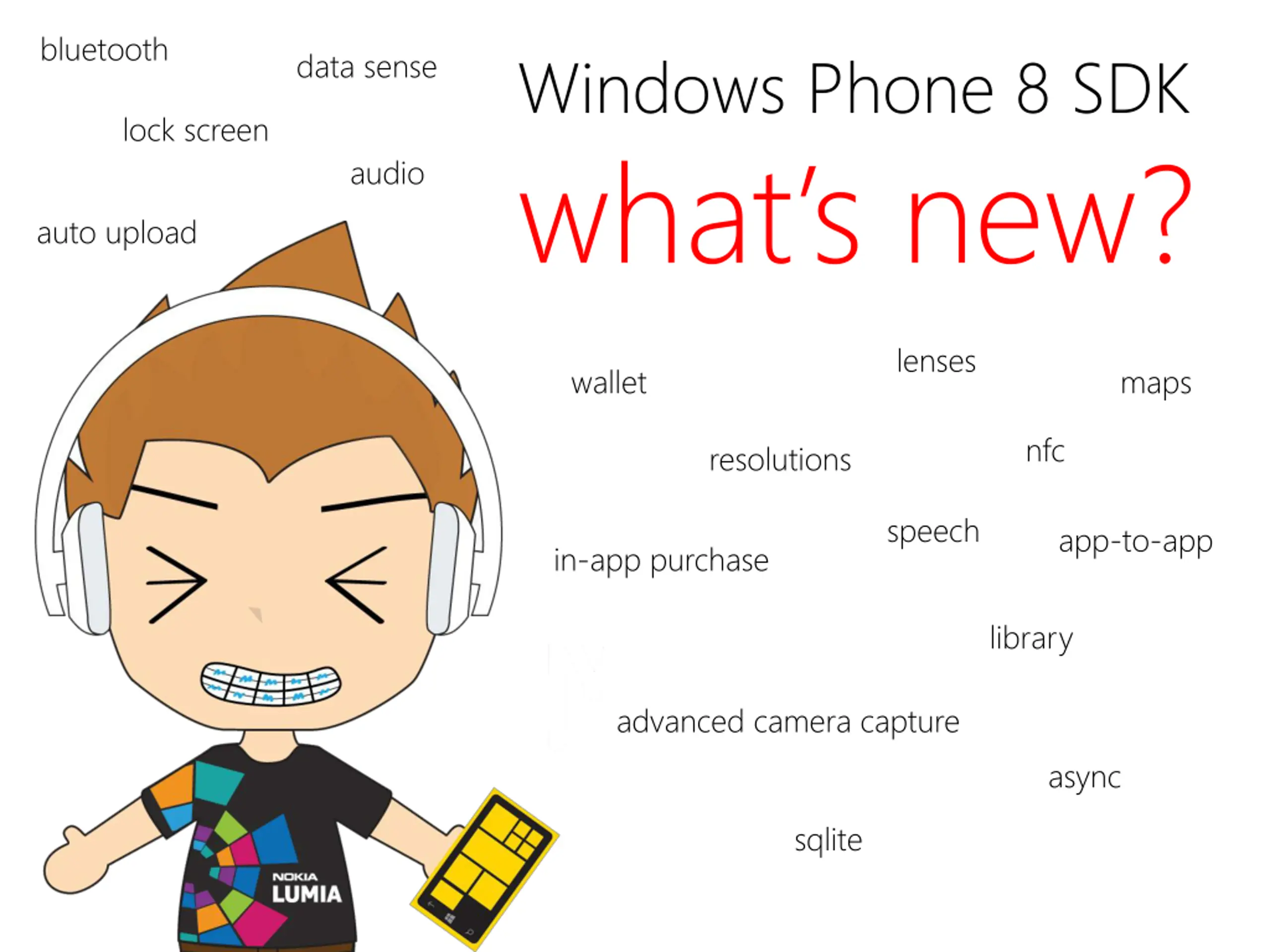 bluetooth Windows Phone 8 SDK what s new? data sense lock screen audio auto upload lenses wallet maps nfc resolutions speech app-to-app in-app purchase library advanced camera capture async sqlite