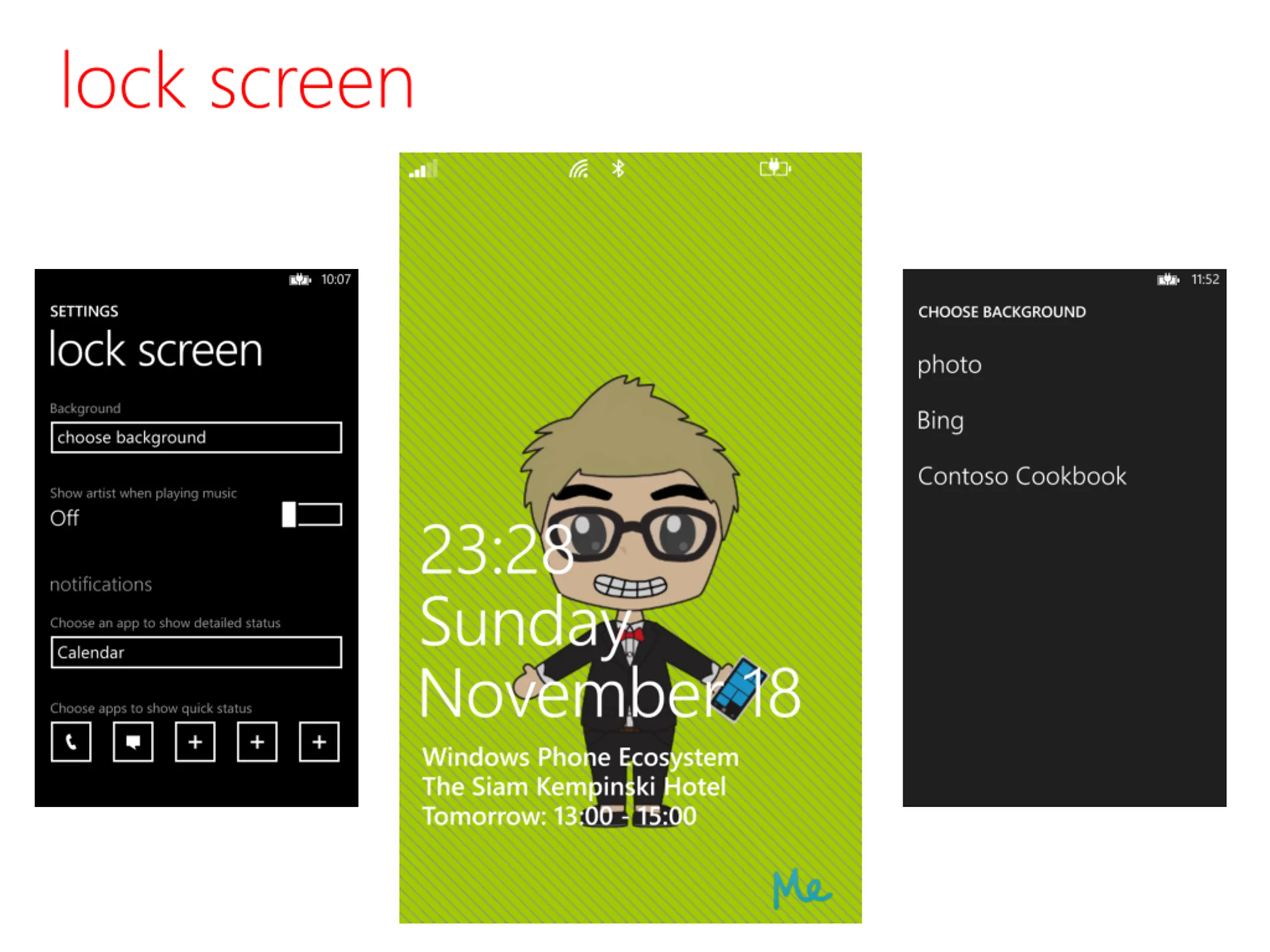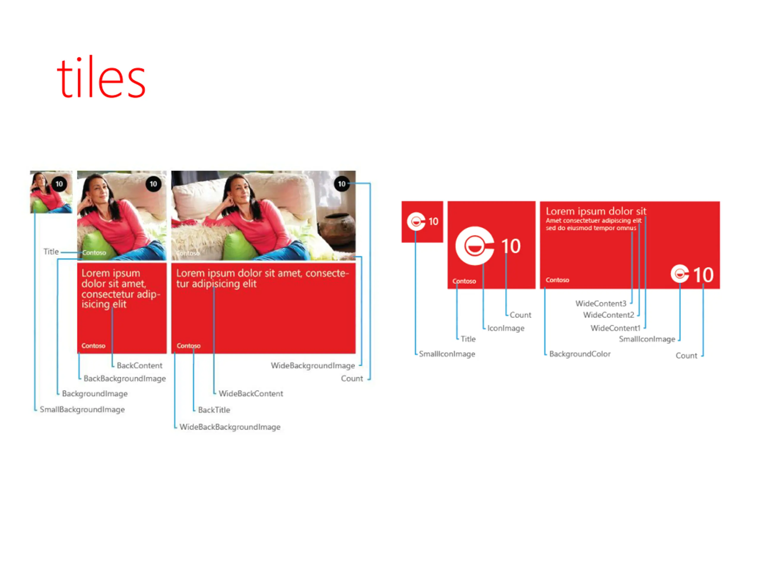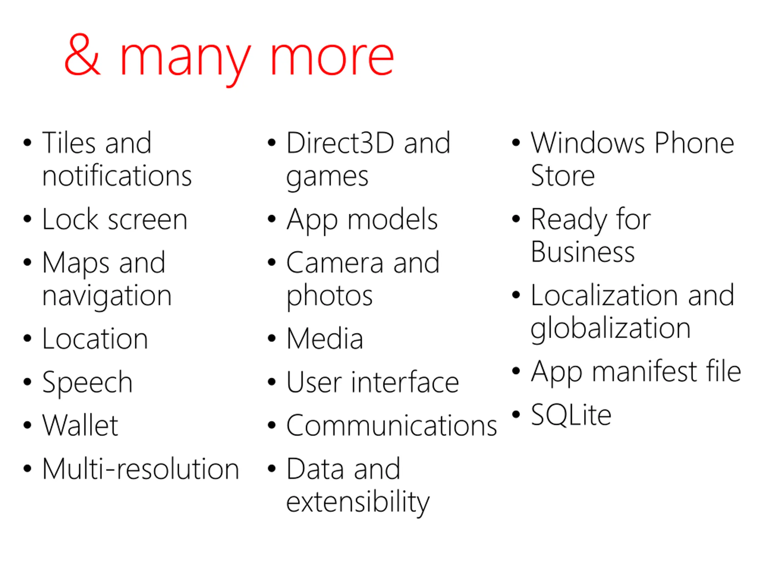 & many more Tiles and notifications Lock screen Maps and navigation Location Speech Wallet Multi-resolution Direct3D and games App models Camera and photos Media User interface Communications Data and extensibility Windows Phone Store Ready for Business Localization and globalization App manifest file SQLite