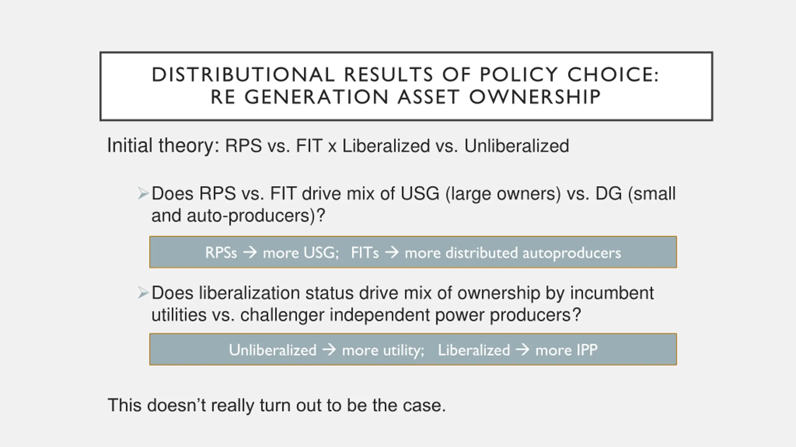 DISTRIBUTIONAL RESULTS OF POLICY CHOICE: RE GENERATION ASSET OWNERSHIP Initial theory: RPS vs. FIT x Liberalized vs. Unliberalized Does RPS vs. FIT drive mix of USG (large owners) vs. DG (small and auto-producers)? RPSs more USG; FITs more distributed autoproducers Does liberalization status drive mix of ownership by incumbent utilities vs. challenger independent power producers? Unliberalized more utility; Liberalized more IPP This doesn t really turn out to be the case.