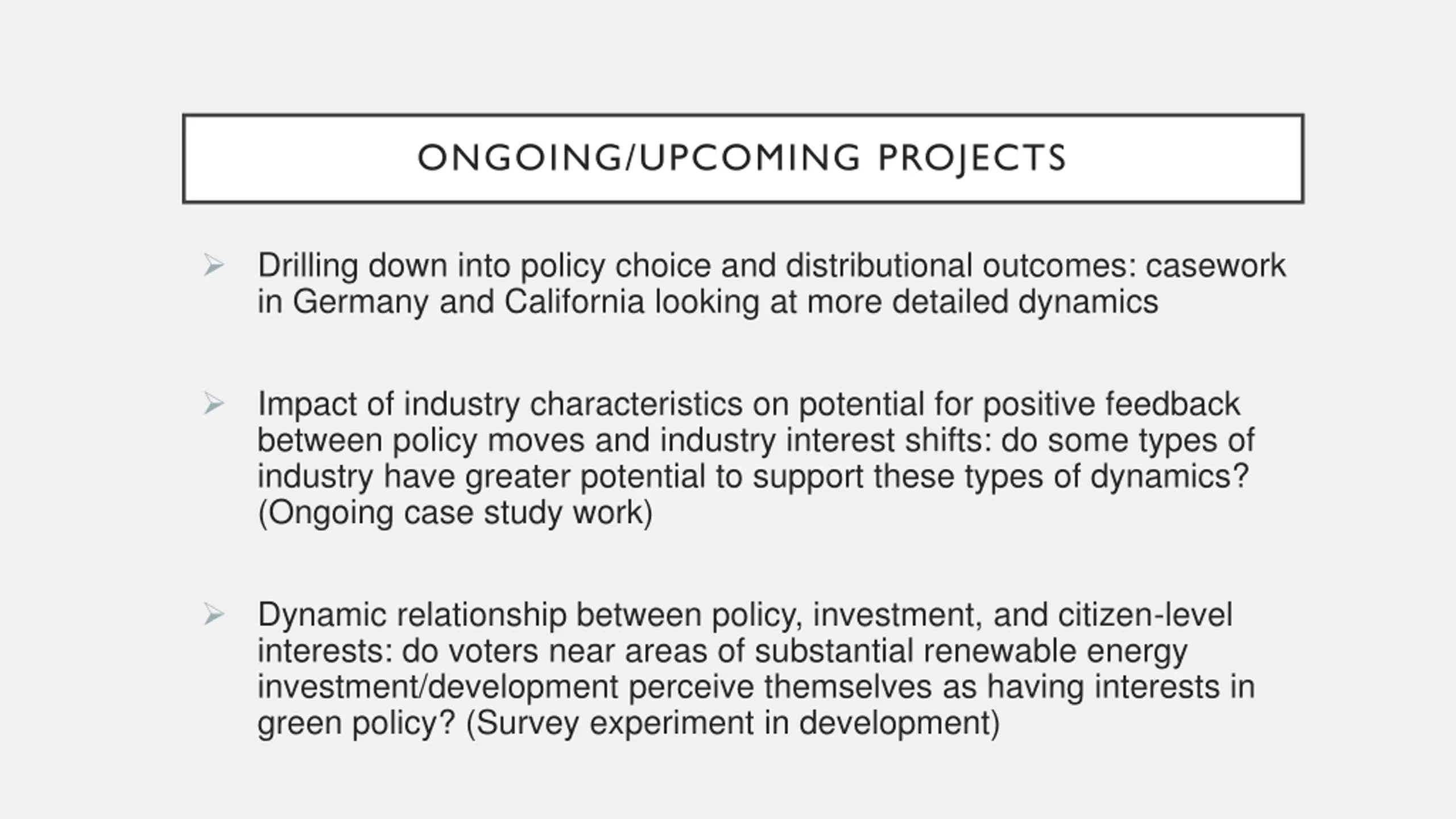 ONGOING/UPCOMING PROJECTS Drilling down into policy choice and distributional outcomes: casework in Germany and California looking at more detailed dynamics Impact of industry characteristics on potential for positive feedback between policy moves and industry interest shifts: do some types of industry have greater potential to support these types of dynamics? (Ongoing case study work) Dynamic relationship between policy, investment, and citizen-level interests: do voters near areas of substantial renewable energy investment/development perceive themselves as having interests in green policy? (Survey experiment in development)