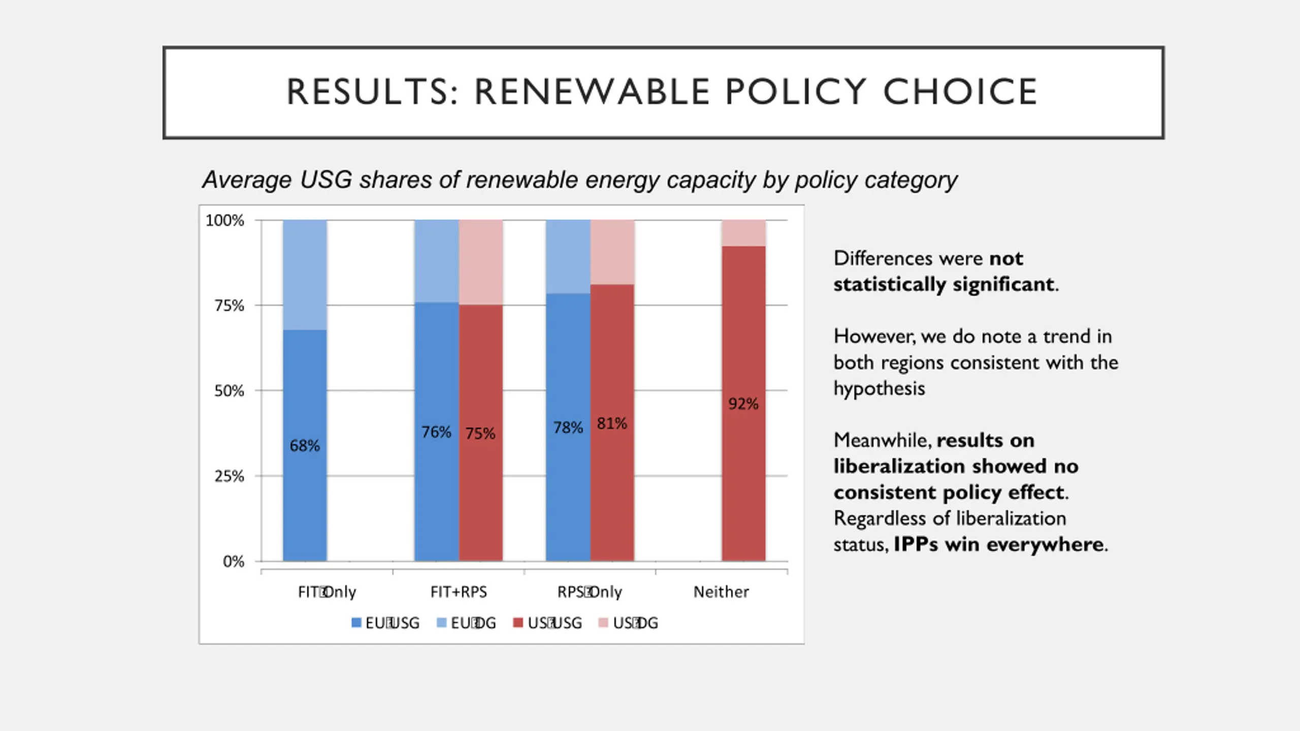 RESULTS: RENEWABLE POLICY CHOICE Average USG shares of renewable energy capacity by policy category 100% Differences were not statistically significant. 75% However, we do note a trend in both regions consistent with the hypothesis 50% 92% 81% 78% 76% 75% Meanwhile, results on liberalization showed no consistent policy effect. Regardless of liberalization status, IPPs win everywhere. 68% 25% 0% FIT? Only FIT? +? RPS RPS? Only Neither FIT? Only FIT+RPS RPS? Only Neither EU? USG EU? DG US? USG US? DG