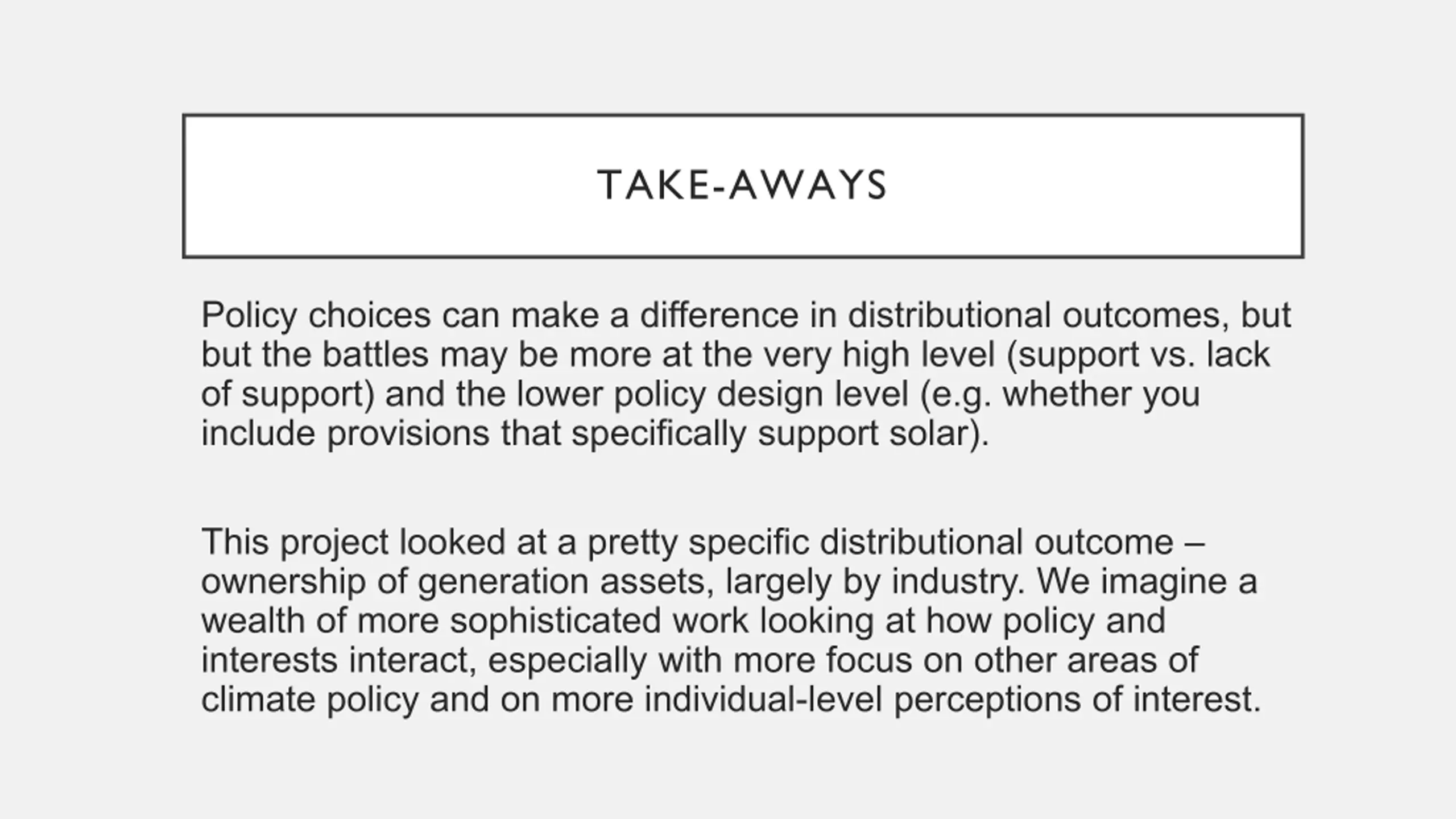 TAKE-AWAYS Policy choices can make a difference in distributional outcomes, but but the battles may be more at the very high level (support vs. lack of support) and the lower policy design level (e.g. whether you include provisions that specifically support solar). This project looked at a pretty specific distributional outcome ownership of generation assets, largely by industry. We imagine a wealth of more sophisticated work looking at how policy and interests interact, especially with more focus on other areas of climate policy and on more individual-level perceptions of interest.