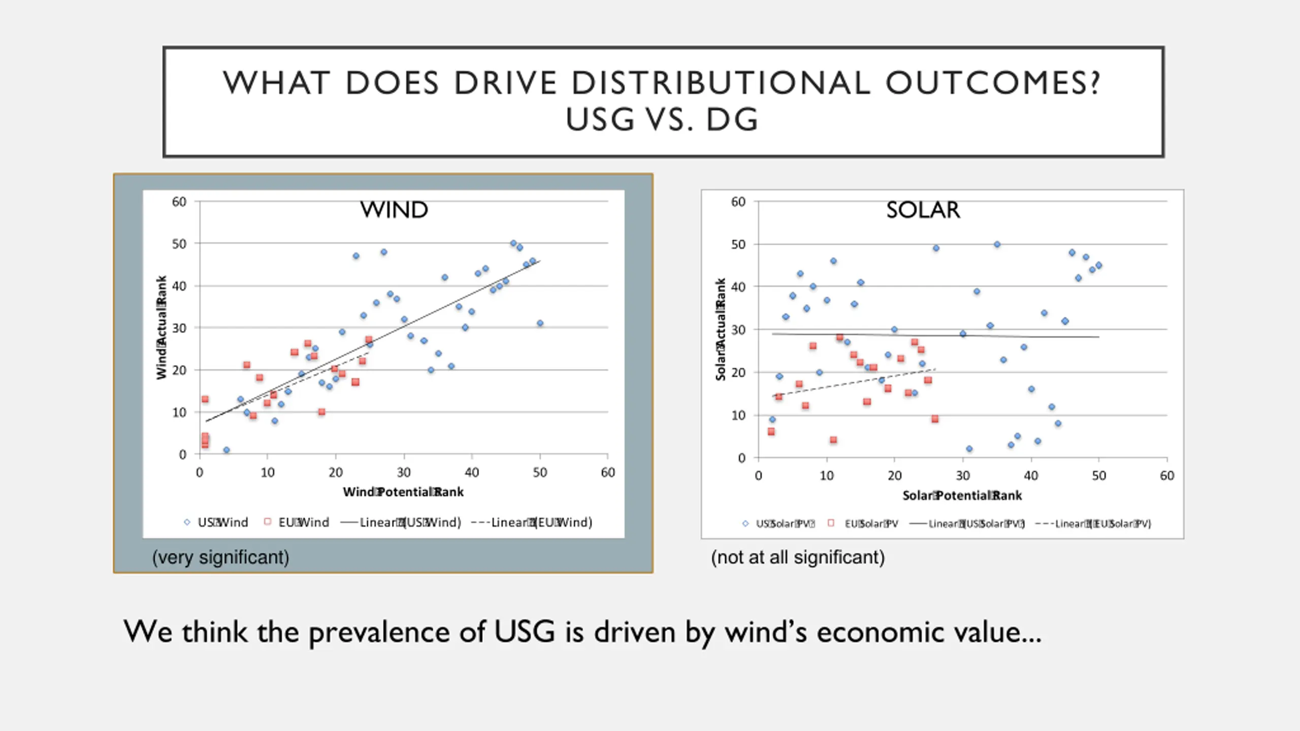 WHAT DOES DRIVE DISTRIBUTIONAL OUTCOMES? USG VS. DG WIND SOLAR 60 60 50 50 Wind? Actual? Rank Solar? Actual? Rank 40 40 30 30 20 20 10 10 0 0 0 10 20 30 40 50 60 0 10 20 30 40 50 60 Wind? Potential? Rank Solar? Potential? Rank US? Wind EU? Wind Linear? ? (US? Wind) Linear? ? (EU? Wind) US? Solar? PV? EU? Solar? PV Linear? ? (US? Solar? PV? ) Linear? ? (? EU? Solar? PV) (not at all significant) (very significant) ...but while something causes variation in solar, it doesn t look like it s resources.