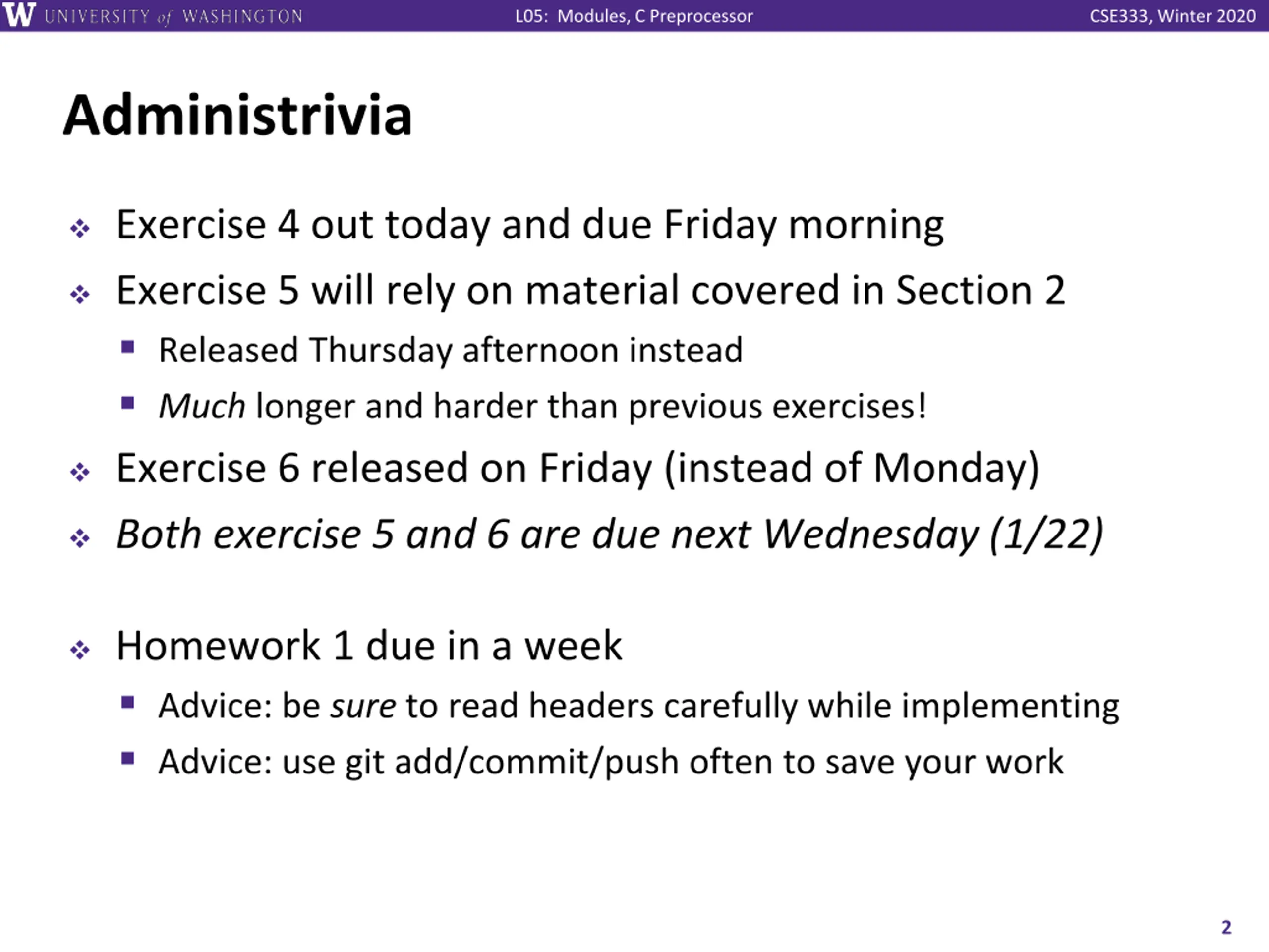 L05: Modules, C Preprocessor CSE333, Winter 2020 Administrivia Exercise 4 out today and due Friday morning Exercise 5 will rely on material covered in Section 2 Released Thursday afternoon instead Much longer and harder than previous exercises! Exercise 6 released on Friday (instead of Monday) Both exercise 5 and 6 are due next Wednesday (1/22) Homework 1 due in a week Advice: be sure to read headers carefully while implementing Advice: use git add/commit/push often to save your work 2