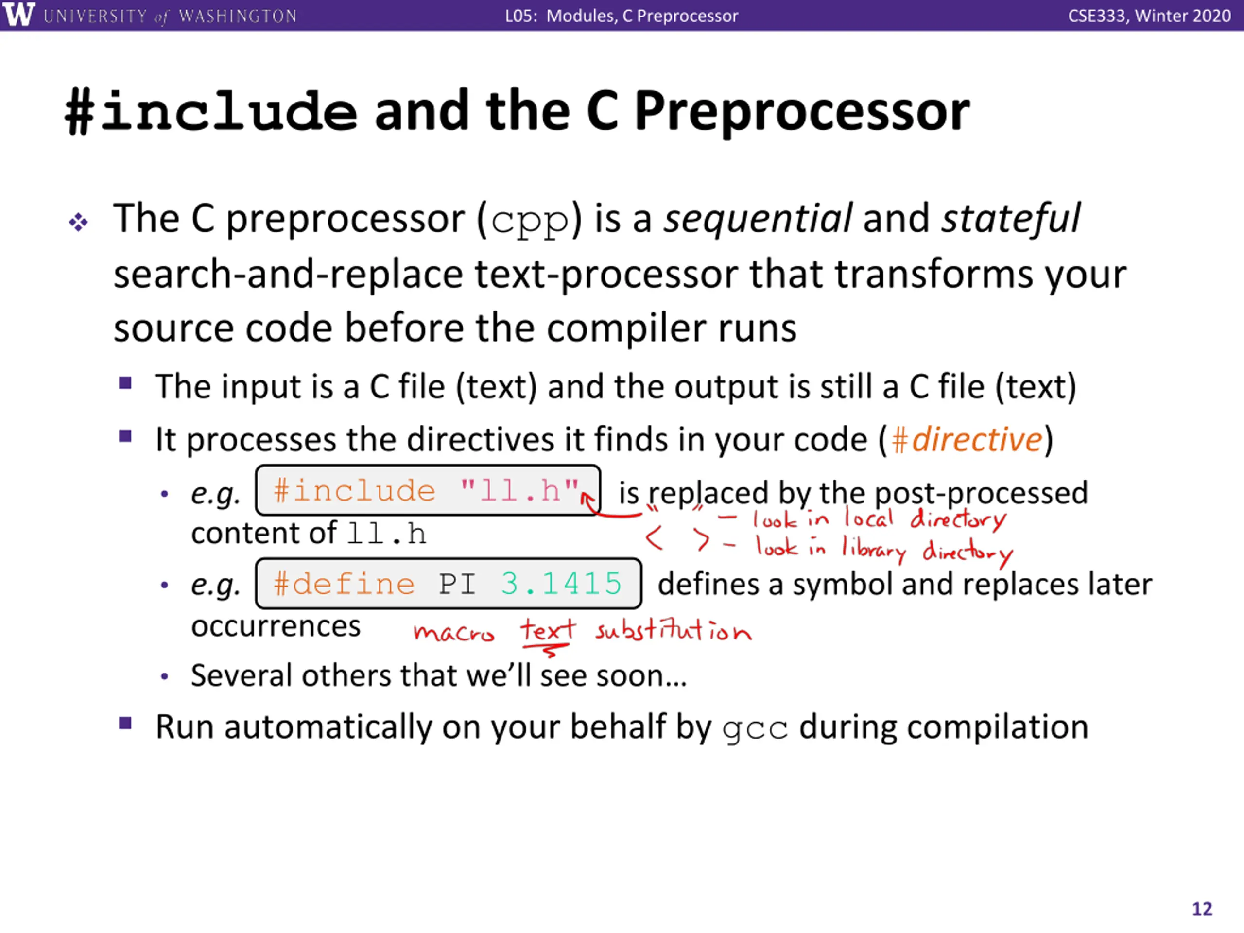 L05: Modules, C Preprocessor CSE333, Winter 2020 #include and the C Preprocessor The C preprocessor (cpp) is a sequential and stateful search-and-replace text-processor that transforms your source code before the compiler runs The input is a C file (text) and the output is still a C file (text) It processes the directives it finds in your code (#directive) is replaced by the post-processed content of ll.h defines a symbol and replaces later occurrences e.g. #include "ll.h" #include "ll.h" e.g. #define PI 3.1415 #define PI 3.1415 Several others that we ll see soon Run automatically on your behalf by gcc during compilation 12