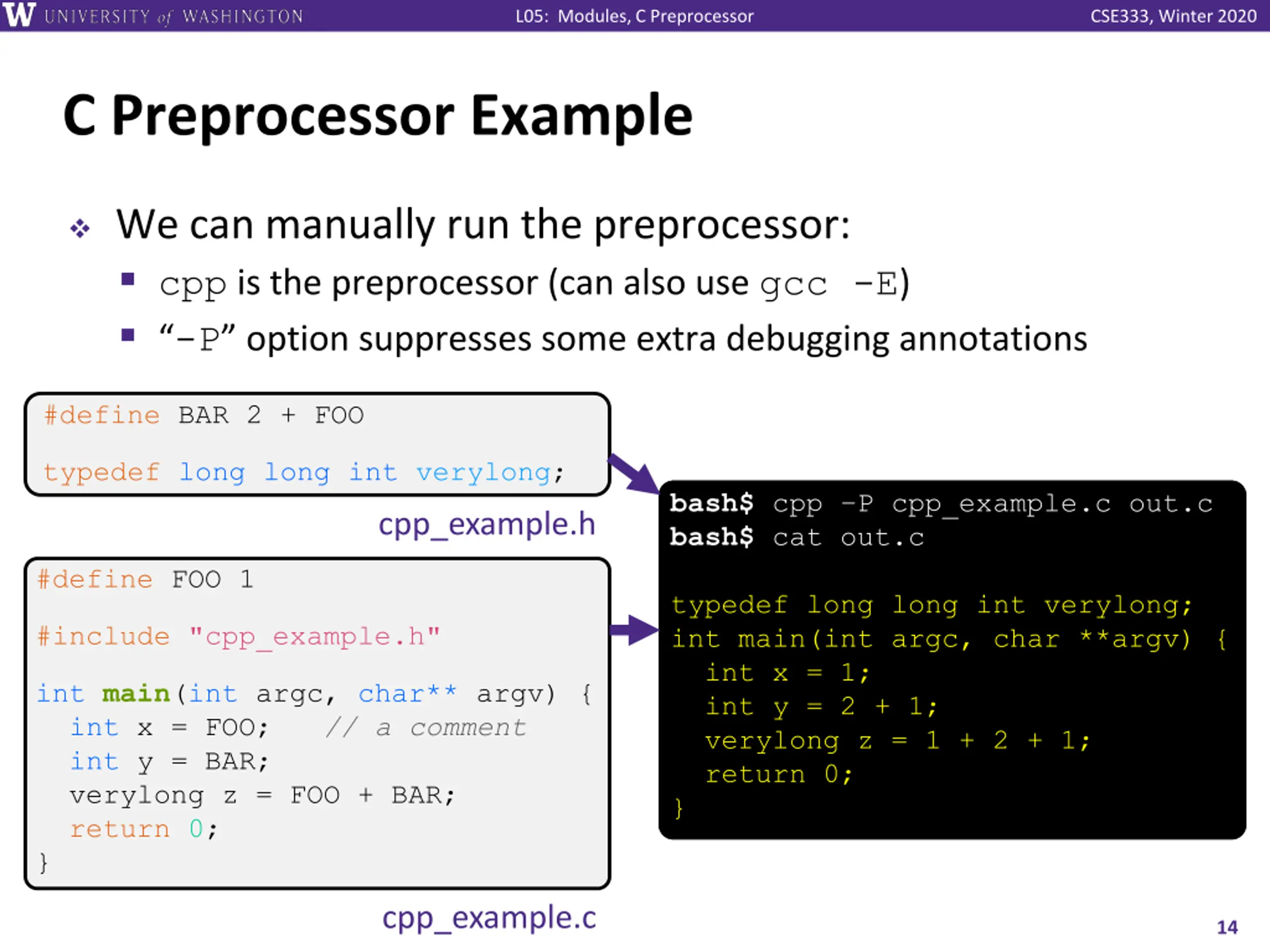 L05: Modules, C Preprocessor CSE333, Winter 2020 C Preprocessor Example We can manually run the preprocessor: cpp is the preprocessor (can also use gcc -E) -P option suppresses some extra debugging annotations #define BAR 2 + FOO typedef long long int verylong; bash$ cpp P cpp_example.c out.c bash$ cpp P cpp_example.c out.c bash$ cat out.c cpp_example.h #define FOO 1 typedef long long int verylong; int main(int argc, char **argv) { int x = 1; int y = 2 + 1; verylong z = 1 + 2 + 1; return 0; } #include "cpp_example.h" int main(int argc, char** argv) { int x = FOO; // a comment int y = BAR; verylong z = FOO + BAR; return 0; } cpp_example.c 14