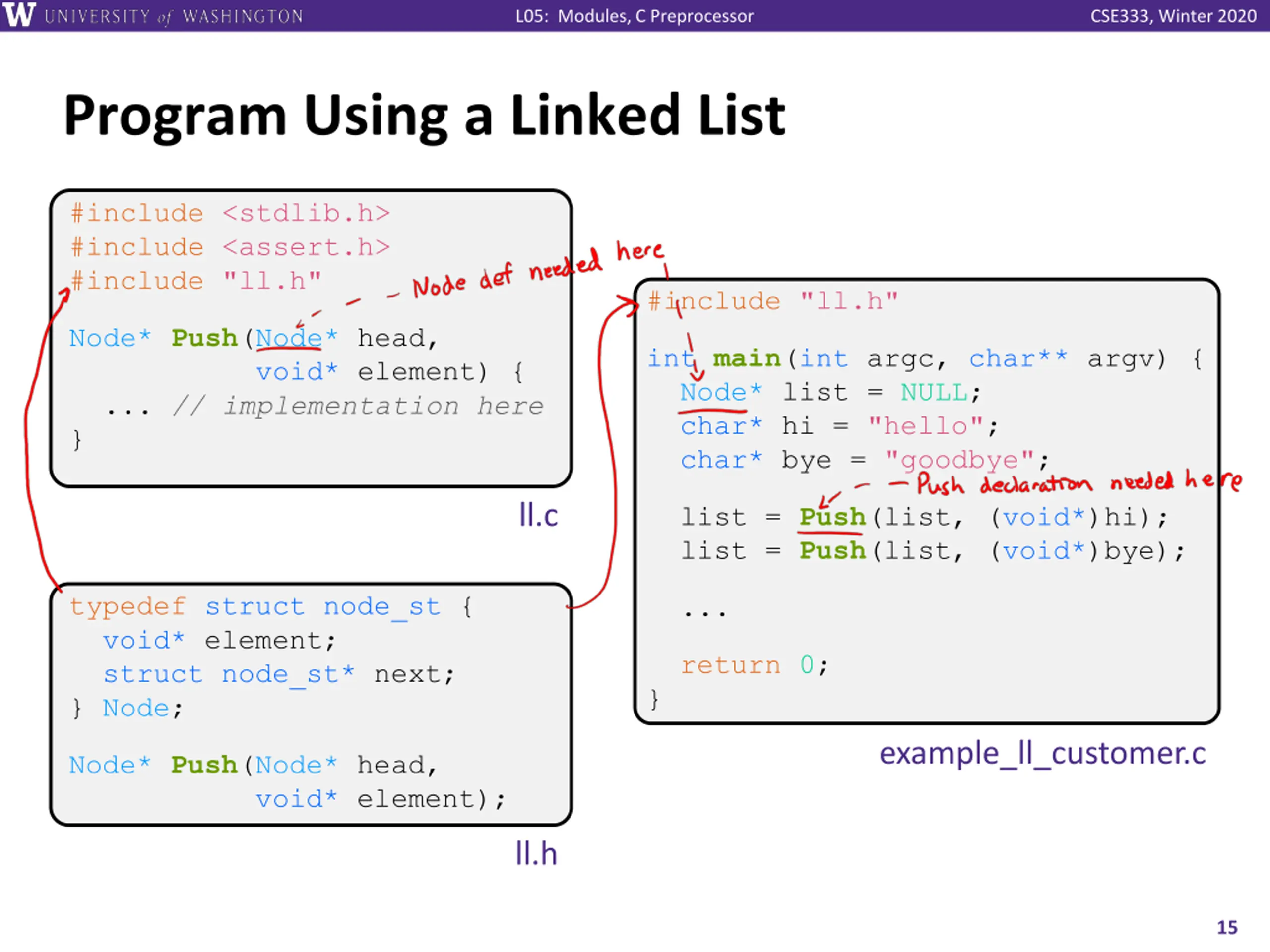 L05: Modules, C Preprocessor CSE333, Winter 2020 Program Using a Linked List #include <stdlib.h> #include <assert.h> #include "ll.h" #include "ll.h" Node* Push(Node* head, void* element) { ... // implementation here } int main(int argc, char** argv) { Node* list = NULL; char* hi = "hello"; char* bye = "goodbye"; ll.c list = Push(list, (void*)hi); list = Push(list, (void*)bye); typedef struct node_st { void* element; struct node_st* next; } Node; ... return 0; } example_ll_customer.c Node* Push(Node* head, void* element); ll.h 15