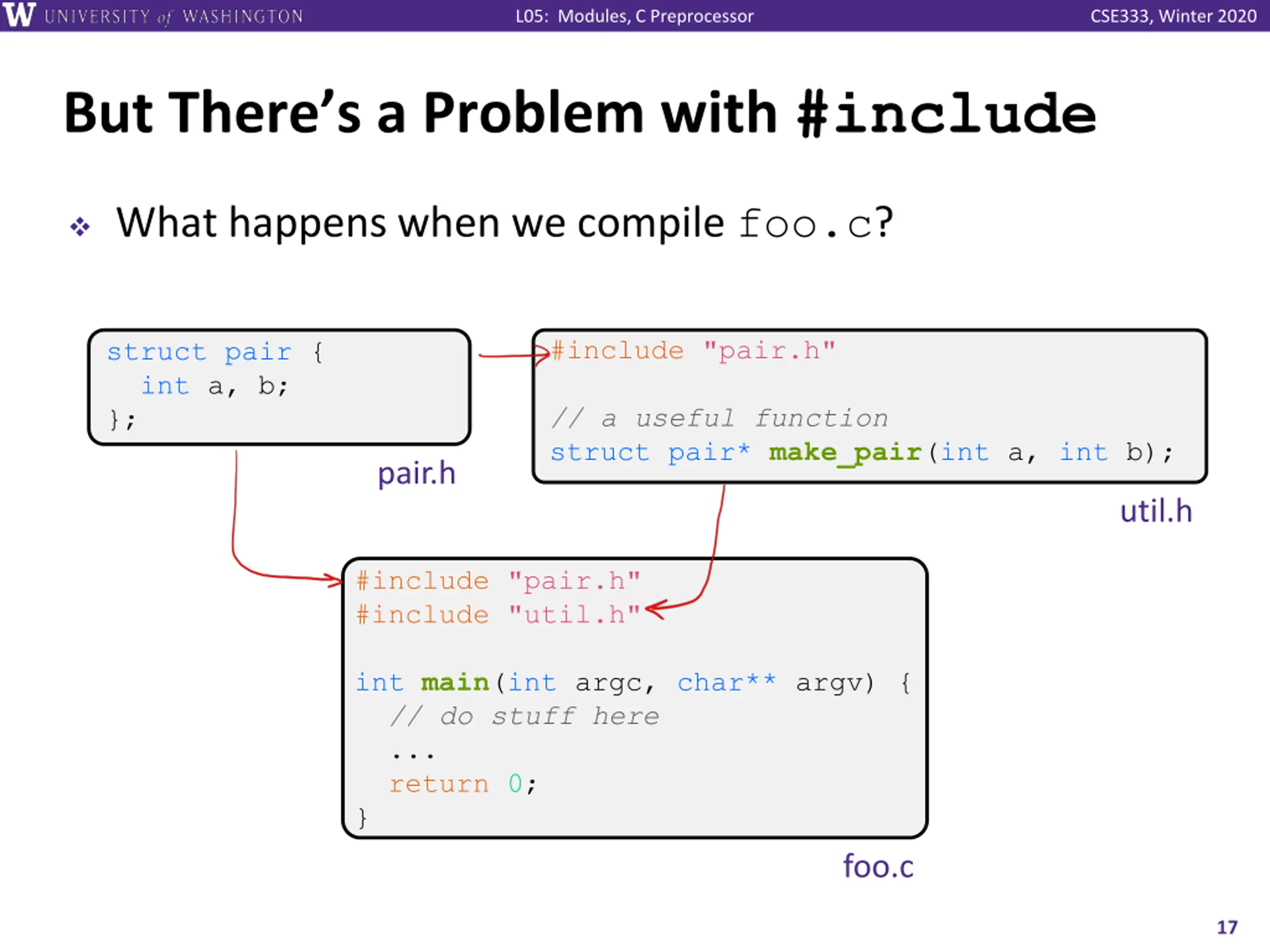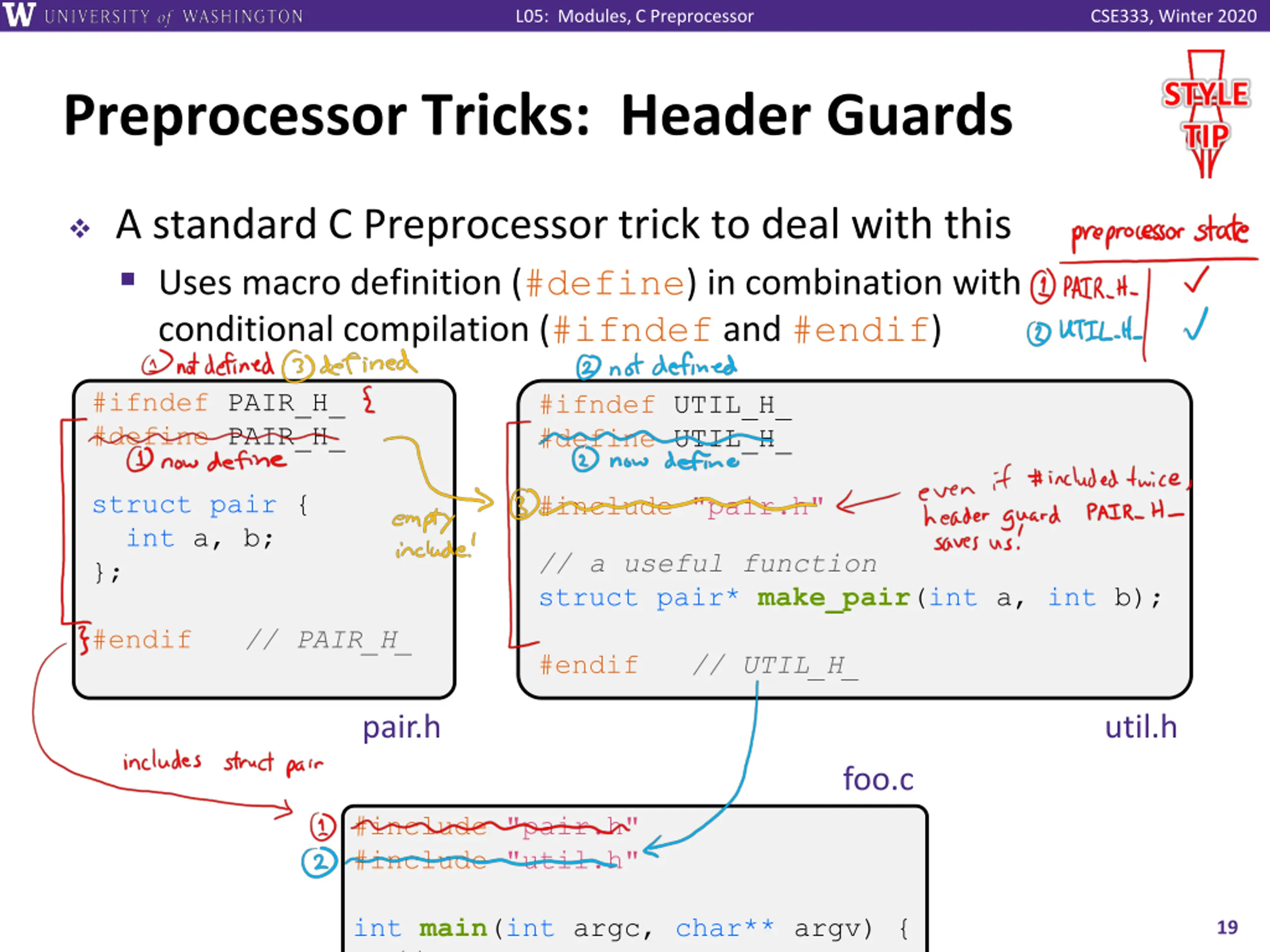 L05: Modules, C Preprocessor CSE333, Winter 2020 A Problem with #include What happens when we compile foo.c? bash$ gcc Wall g -o foo foo.c In file included from util.h:1:0, from foo.c:2: pair.h:1:8: error: redefinition of 'struct pair' struct pair { int a, b; }; ^ In file included from foo.c:1:0: pair.h:1:8: note: originally defined here struct pair { int a, b; }; ^ foo.c includes pair.h twice! Second time is indirectly via util.h Struct definition shows up twice Can see using cpp 18