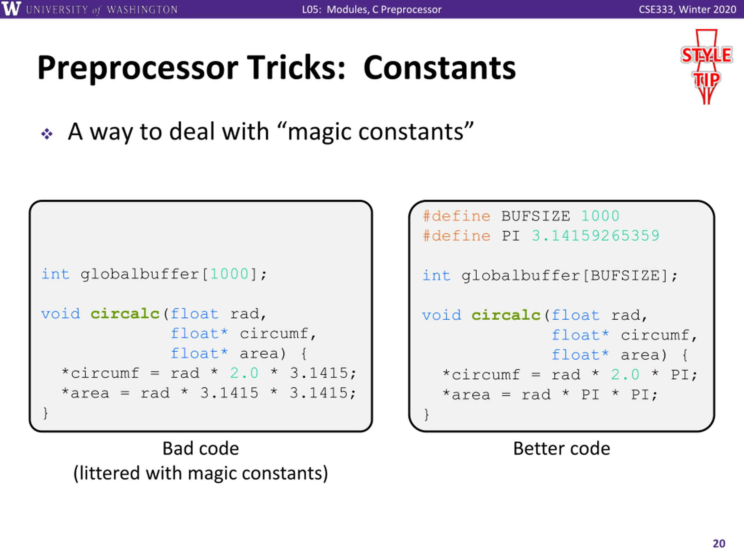 L05: Modules, C Preprocessor CSE333, Winter 2020 STYLE TIP Preprocessor Tricks: Constants A way to deal with magic constants #define BUFSIZE 1000 #define PI 3.14159265359 int globalbuffer[1000]; int globalbuffer[BUFSIZE]; void circalc(float rad, float* circumf, float* area) { *circumf = rad * 2.0 * 3.1415; *area = rad * 3.1415 * 3.1415; } void circalc(float rad, float* circumf, float* area) { *circumf = rad * 2.0 * PI; *area = rad * PI * PI; } Bad code Better code (littered with magic constants) 20