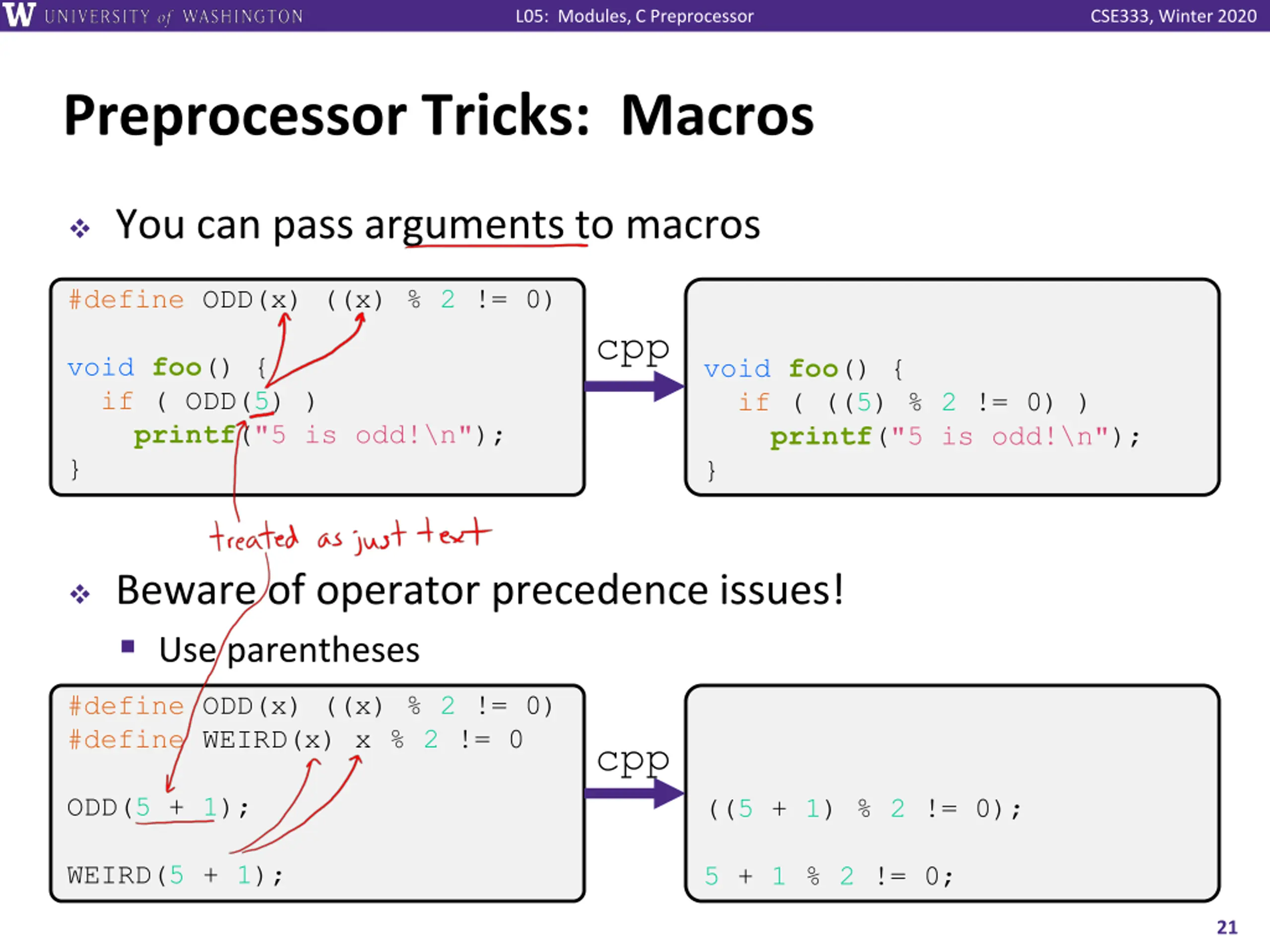 L05: Modules, C Preprocessor CSE333, Winter 2020 Preprocessor Tricks: Macros You can pass arguments to macros #define ODD(x) ((x) % 2 != 0) cpp void foo() { if ( ODD(5) ) printf("5 is odd!\n"); } void foo() { if ( ((5) % 2 != 0) ) printf("5 is odd!\n"); } Beware of operator precedence issues! Use parentheses #define ODD(x) ((x) % 2 != 0) #define WEIRD(x) x % 2 != 0 cpp ODD(5 + 1); ((5 + 1) % 2 != 0); WEIRD(5 + 1); 5 + 1 % 2 != 0; 21