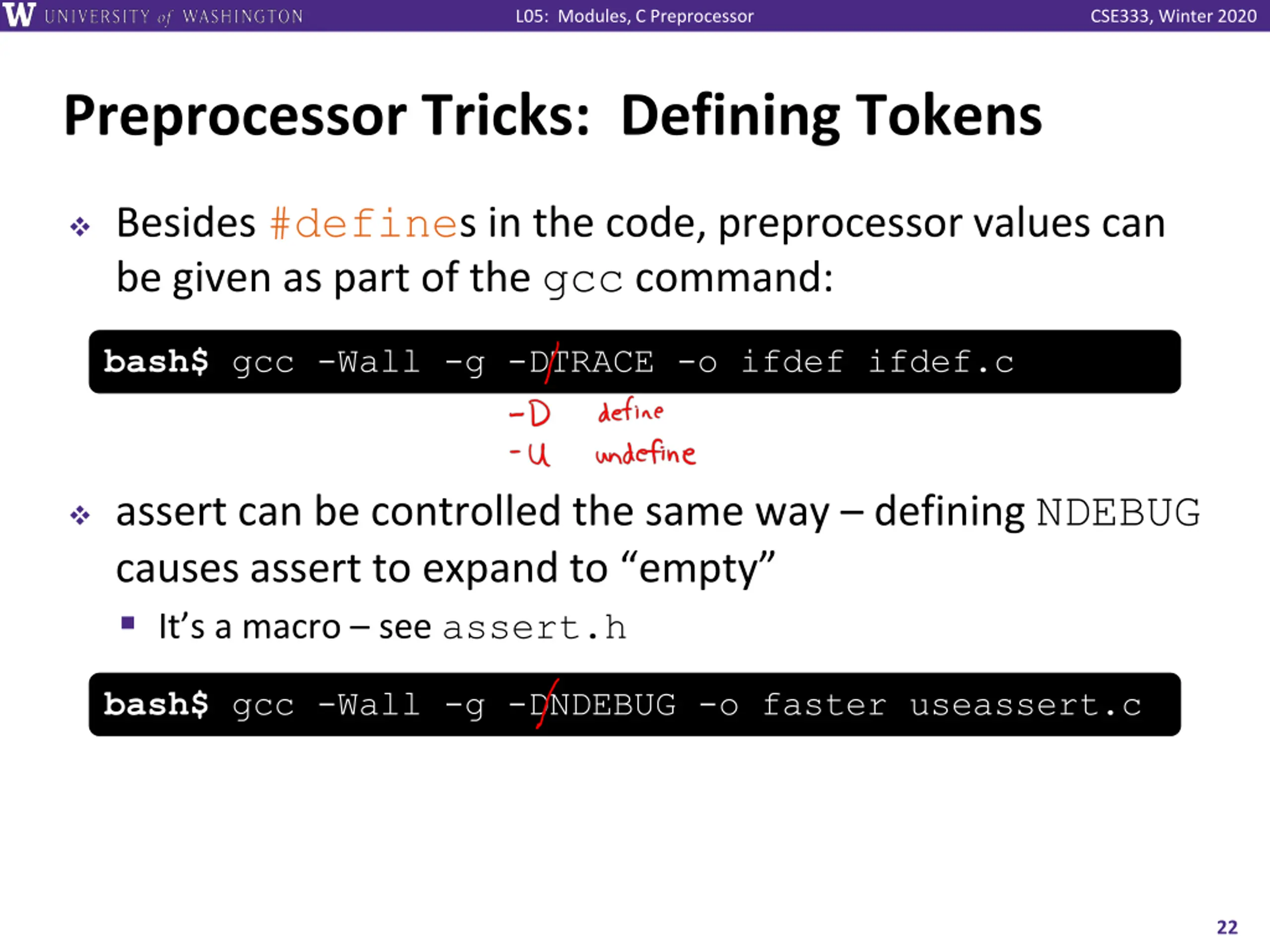 L05: Modules, C Preprocessor CSE333, Winter 2020 Preprocessor Tricks: Defining Tokens Besides #defines in the code, preprocessor values can be given as part of the gcc command: bash$ gcc -Wall -g -DTRACE -o ifdef ifdef.c assert can be controlled the same way defining NDEBUG causes assert to expand to empty It s a macro see assert.h bash$ gcc -Wall -g -DNDEBUG -o faster useassert.c 22
