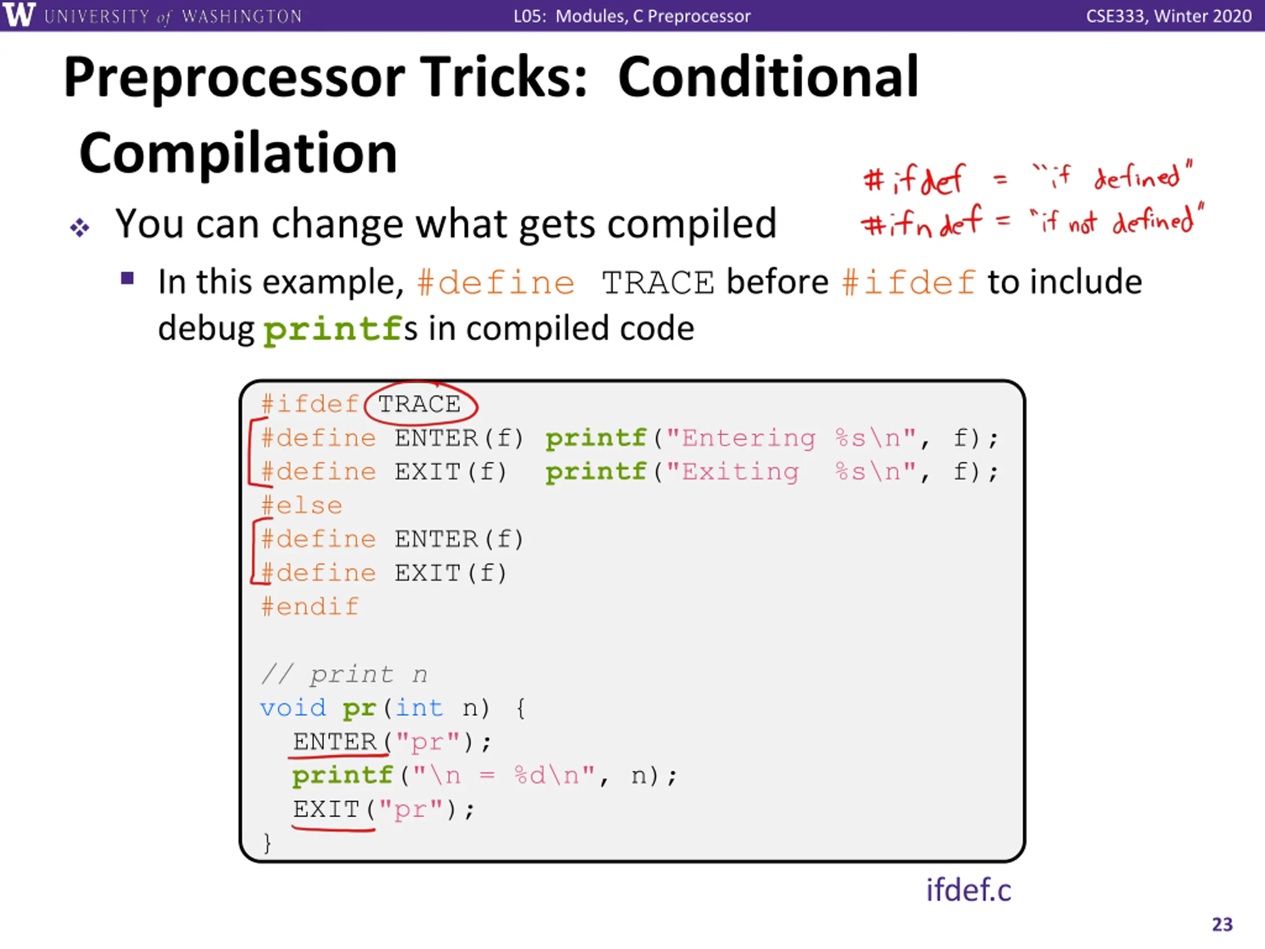 L05: Modules, C Preprocessor CSE333, Winter 2020 Preprocessor Tricks: Conditional Compilation You can change what gets compiled In this example, #define TRACE before #ifdef to include debug printfs in compiled code #ifdef TRACE #define ENTER(f) printf("Entering %s\n", f); #define EXIT(f) printf("Exiting %s\n", f); #else #define ENTER(f) #define EXIT(f) #endif // print n void pr(int n) { ENTER("pr"); printf("\n = %d\n", n); EXIT("pr"); } ifdef.c 23