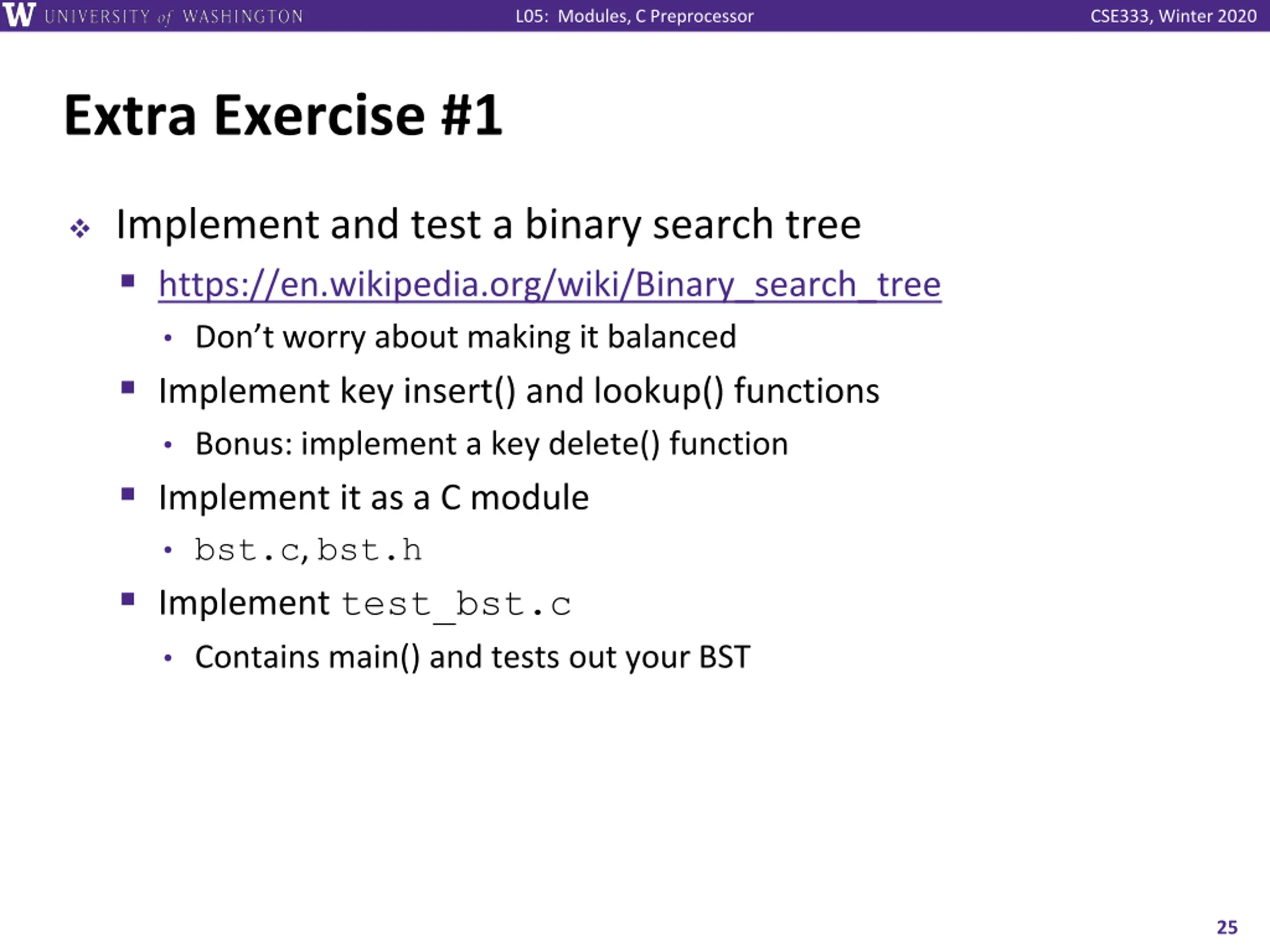 L05: Modules, C Preprocessor CSE333, Winter 2020 Extra Exercise #1 Implement and test a binary search tree https://en.wikipedia.org/wiki/Binary_search_tree Don t worry about making it balanced Implement key insert() and lookup() functions Bonus: implement a key delete() function Implement it as a C module bst.c, bst.h Implement test_bst.c Contains main() and tests out your BST 25