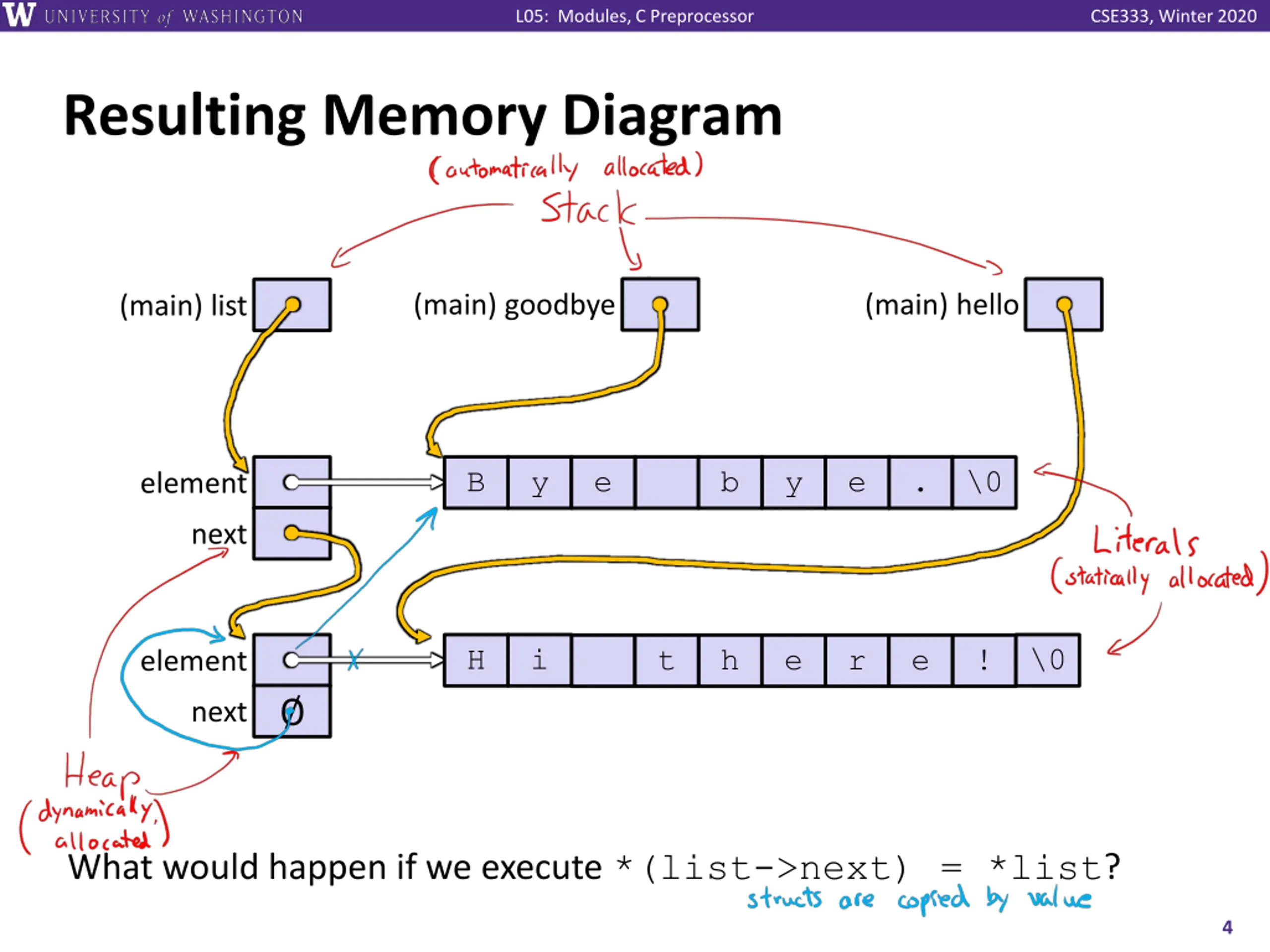L05: Modules, C Preprocessor CSE333, Winter 2020 Resulting Memory Diagram (main) hello (main) goodbye (main) list B y e b y e . \0 element next H i \0 t h e r e ! element next What would happen if we execute *(list->next) = *list? 4