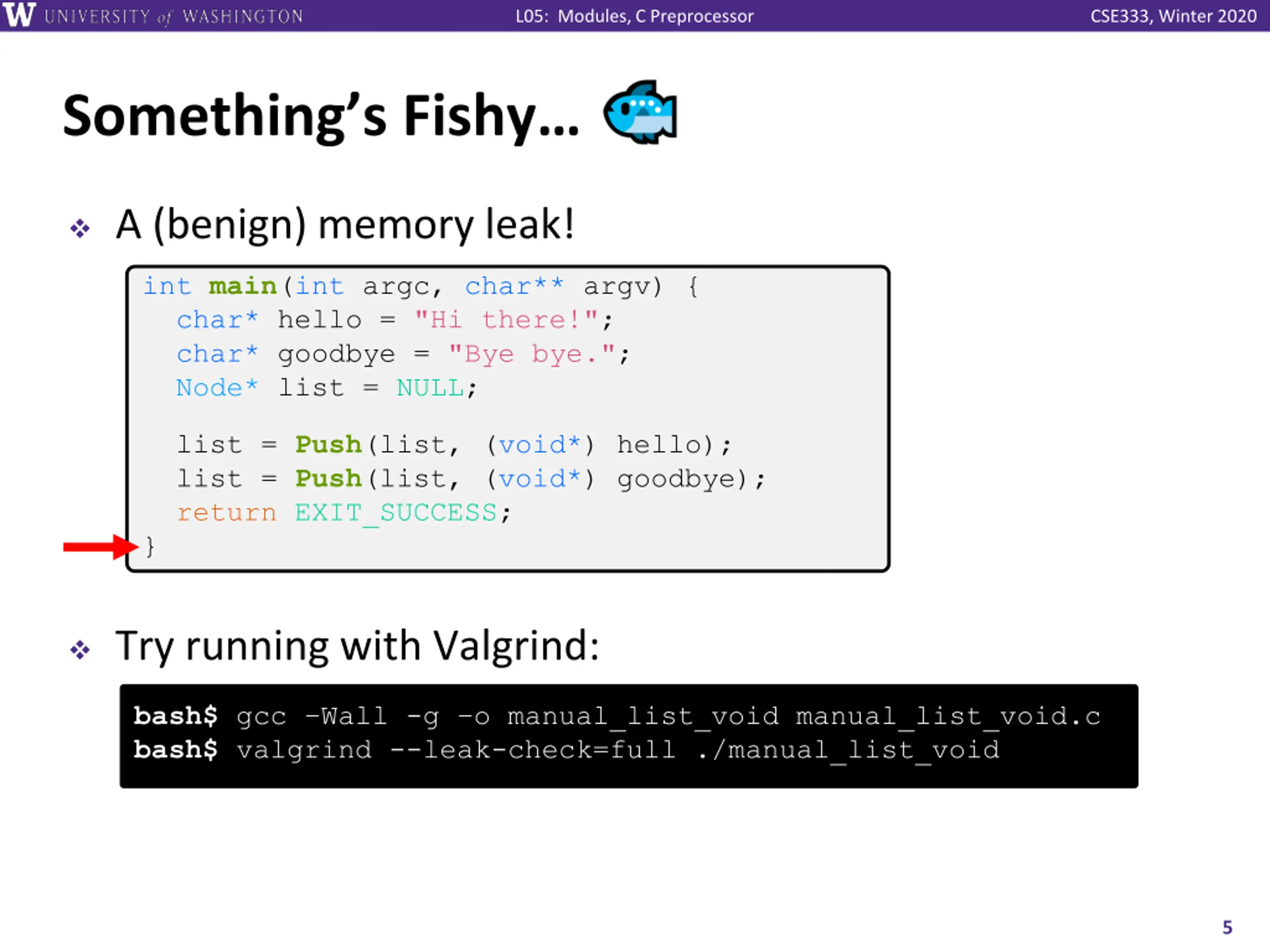 L05: Modules, C Preprocessor CSE333, Winter 2020 Something s Fishy A (benign) memory leak! int main(int argc, char** argv) { char* hello = "Hi there!"; char* goodbye = "Bye bye."; Node* list = NULL; list = Push(list, (void*) hello); list = Push(list, (void*) goodbye); return EXIT_SUCCESS; } Try running with Valgrind: bash$ gcc Wall -g o manual_list_void manual_list_void.c bash$ valgrind --leak-check=full ./manual_list_void 5