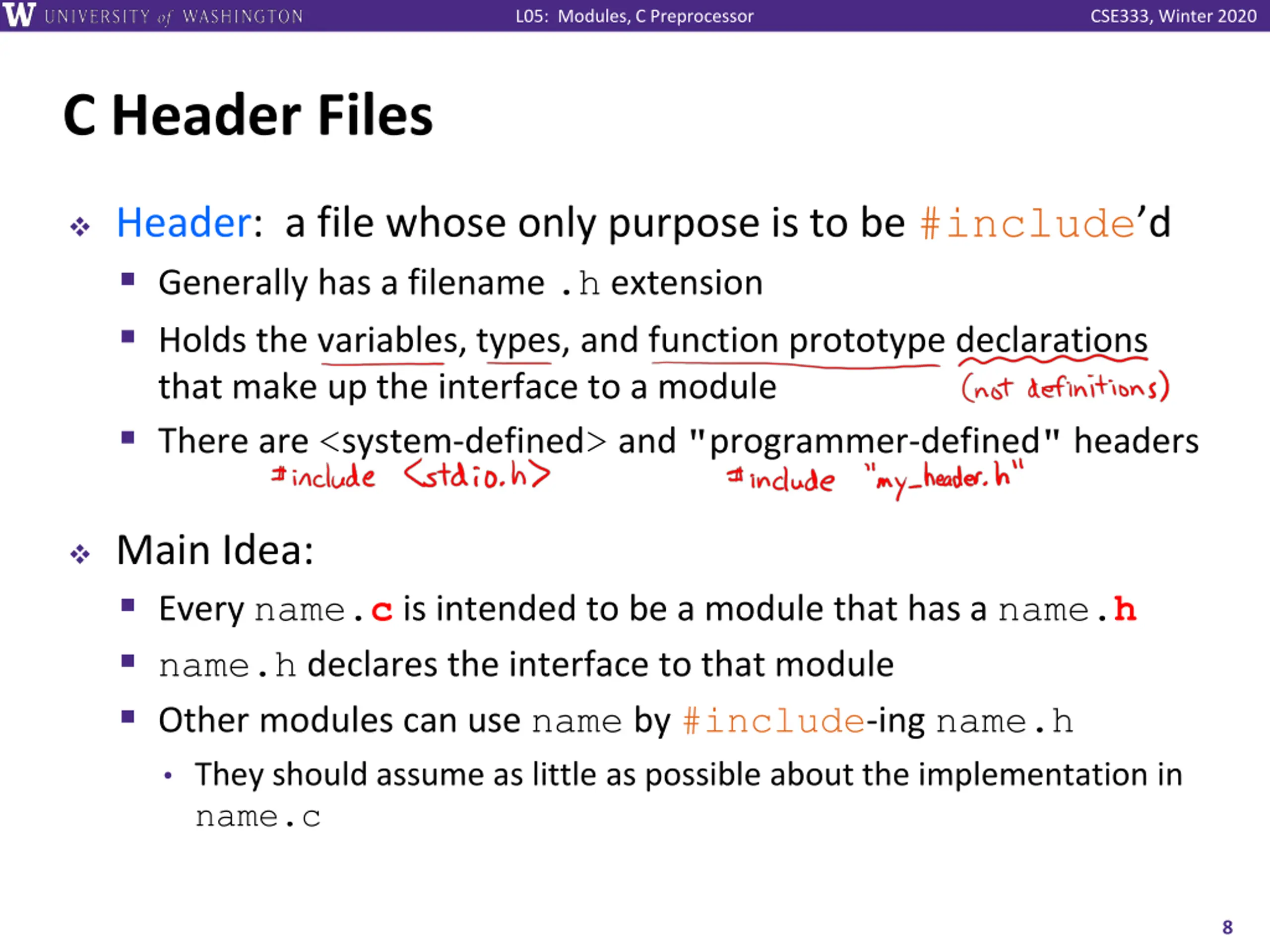 L05: Modules, C Preprocessor CSE333, Winter 2020 C Header Files Header: a file whose only purpose is to be #include d Generally has a filename .h extension Holds the variables, types, and function prototype declarations that make up the interface to a module There are <system-defined> and "programmer-defined" headers Main Idea: Every name.c is intended to be a module that has a name.h name.h declares the interface to that module Other modules can use name by #include-ing name.h They should assume as little as possible about the implementation in name.c 8