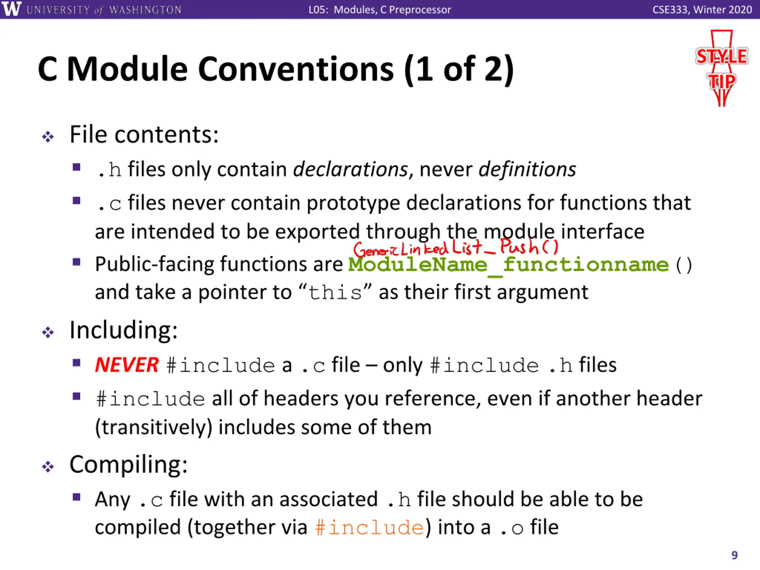L05: Modules, C Preprocessor CSE333, Winter 2020 STYLE TIP C Module Conventions (1 of 2) File contents: .h files only contain declarations, never definitions .c files never contain prototype declarations for functions that are intended to be exported through the module interface Public-facing functions are ModuleName_functionname() and take a pointer to this as their first argument Including: NEVER#include a .c file only #include.h files #include all of headers you reference, even if another header (transitively) includes some of them Compiling: Any .c file with an associated .h file should be able to be compiled (together via #include) into a .o file 9