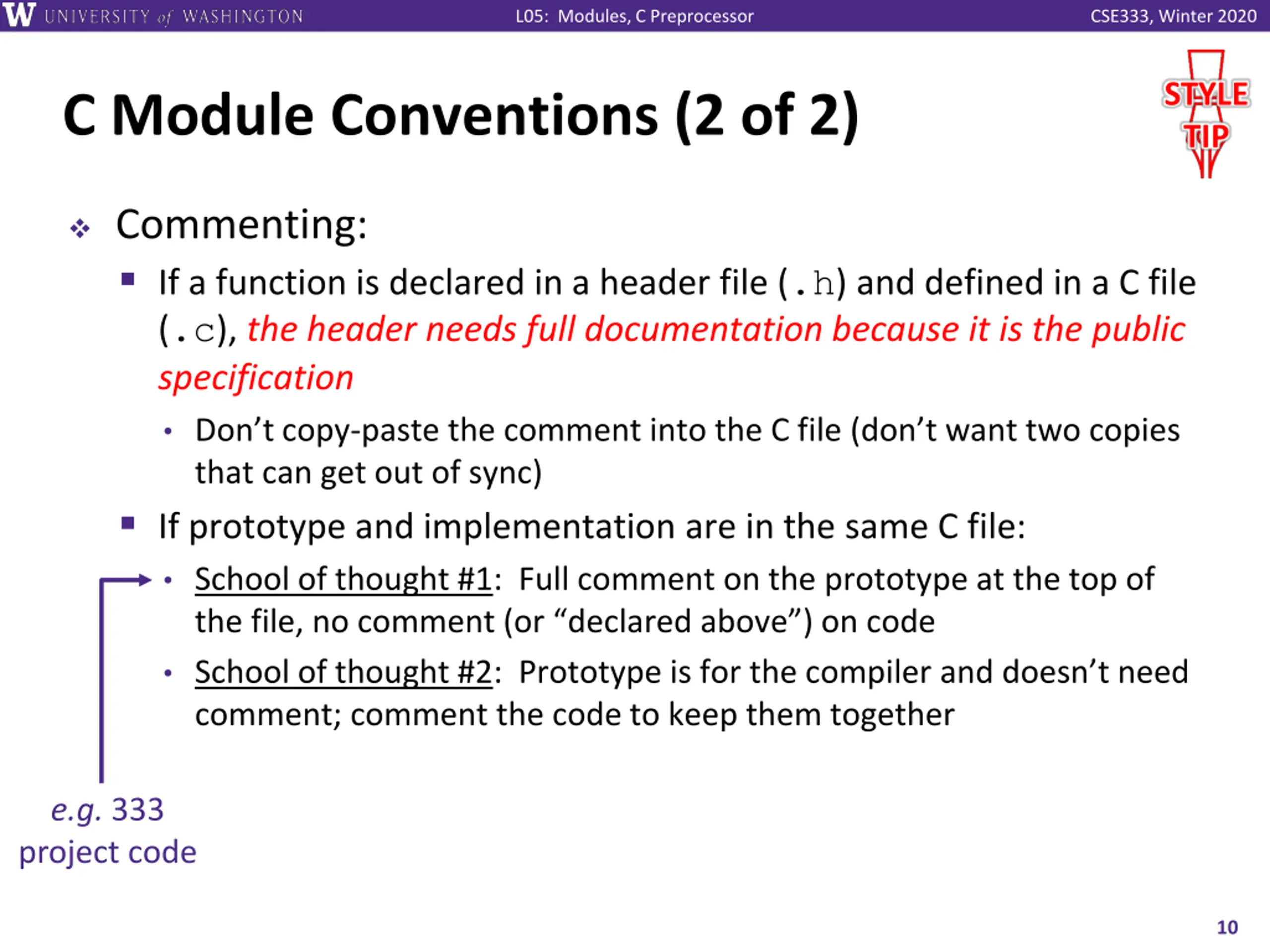 L05: Modules, C Preprocessor CSE333, Winter 2020 STYLE TIP C Module Conventions (2 of 2) Commenting: If a function is declared in a header file (.h) and defined in a C file (.c), the header needs full documentation because it is the public specification Don t copy-paste the comment into the C file (don t want two copies that can get out of sync) If prototype and implementation are in the same C file: School of thought #1: Full comment on the prototype at the top of the file, no comment (or declared above ) on code School of thought #2: Prototype is for the compiler and doesn t need comment; comment the code to keep them together e.g. 333 project code 10