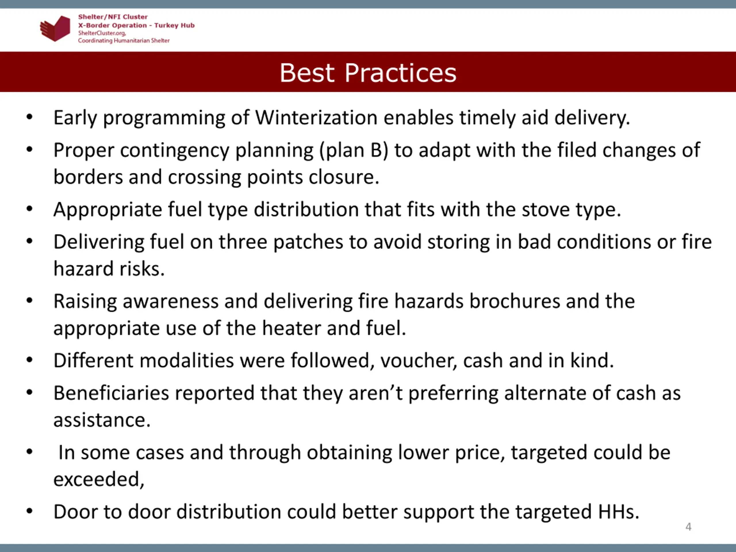 Best Practices Early programming of Winterization enables timely aid delivery. Proper contingency planning (plan B) to adapt with the filed changes of borders and crossing points closure. Appropriate fuel type distribution that fits with the stove type. Delivering fuel on three patches to avoid storing in bad conditions or fire hazard risks. Raising awareness and delivering fire hazards brochures and the appropriate use of the heater and fuel. Different modalities were followed, voucher, cash and in kind. Beneficiaries reported that they aren t preferring alternate of cash as assistance. In some cases and through obtaining lower price, targeted could be exceeded, Door to door distribution could better support the targeted HHs. 4