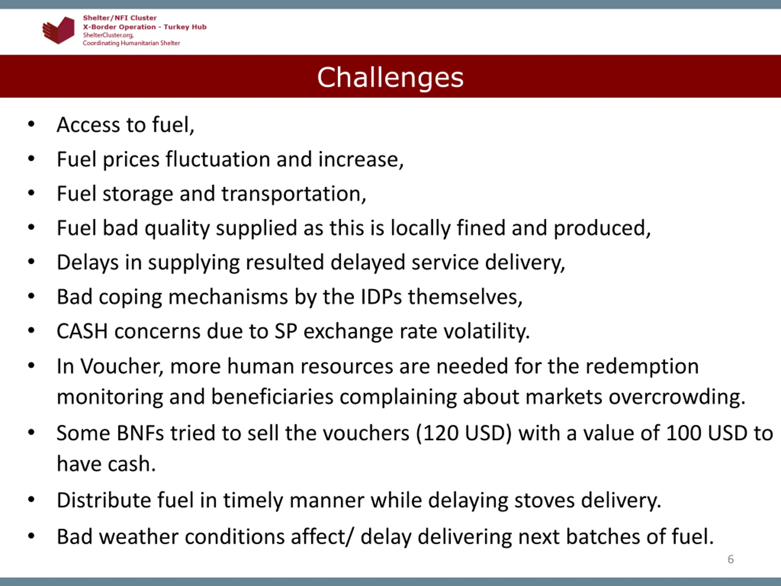 Challenges Access to fuel, Fuel prices fluctuation and increase, Fuel storage and transportation, Fuel bad quality supplied as this is locally fined and produced, Delays in supplying resulted delayed service delivery, Bad coping mechanisms by the IDPs themselves, CASH concerns due to SP exchange rate volatility. In Voucher, more human resources are needed for the redemption monitoring and beneficiaries complaining about markets overcrowding. Some BNFs tried to sell the vouchers (120 USD) with a value of 100 USD to have cash. Distribute fuel in timely manner while delaying stoves delivery. Bad weather conditions affect/ delay delivering next batches of fuel. 6