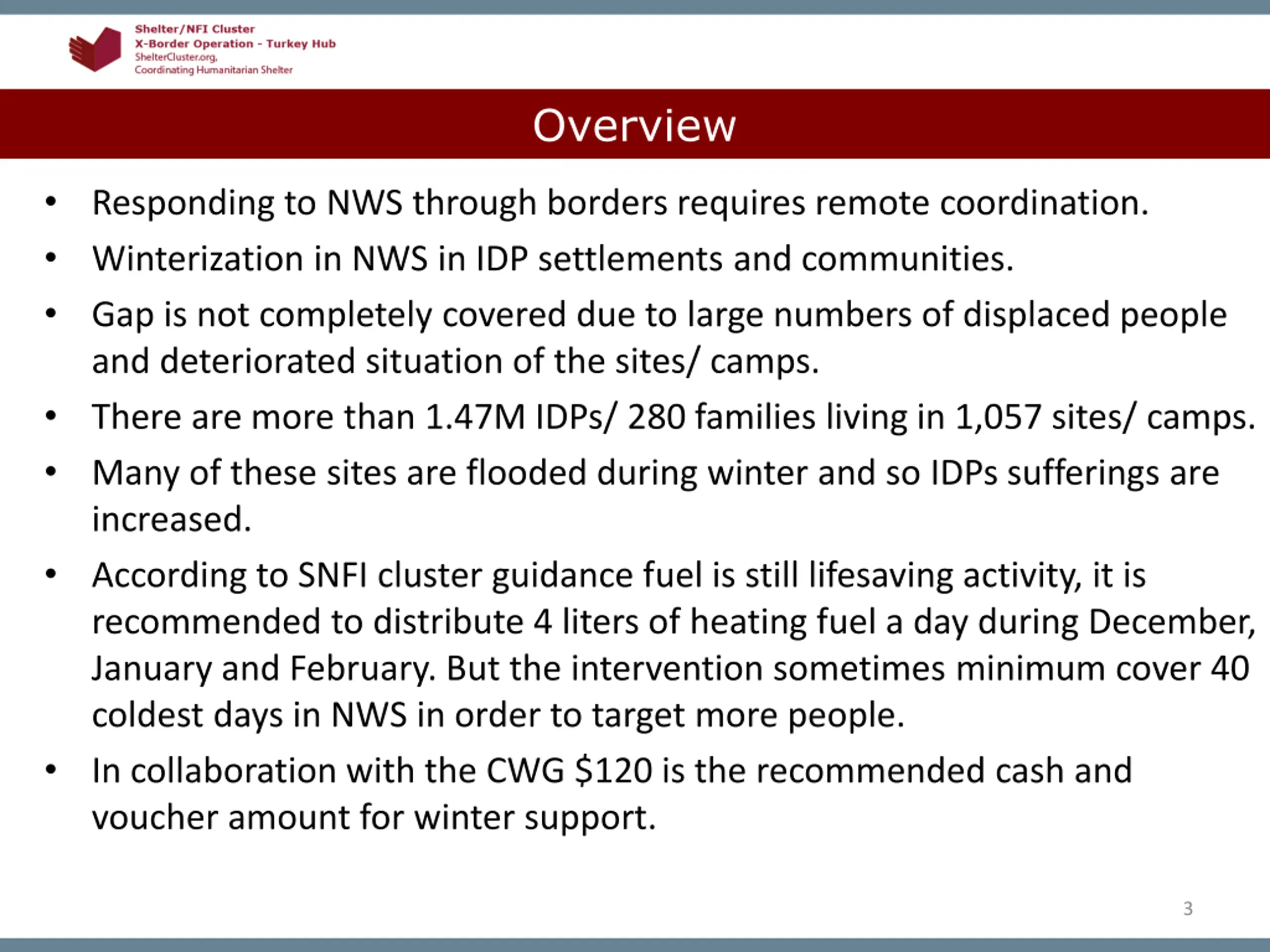 Overview Responding to NWS through borders requires remote coordination. Winterization in NWS in IDP settlements and communities. Gap is not completely covered due to large numbers of displaced people and deteriorated situation of the sites/ camps. There are more than 1.47M IDPs/ 280 families living in 1,057 sites/ camps. Many of these sites are flooded during winter and so IDPs sufferings are increased. According to SNFI cluster guidance fuel is still lifesaving activity, it is recommended to distribute 4 liters of heating fuel a day during December, January and February. But the intervention sometimes minimum cover 40 coldest days in NWS in order to target more people. In collaboration with the CWG $120 is the recommended cash and voucher amount for winter support. 3