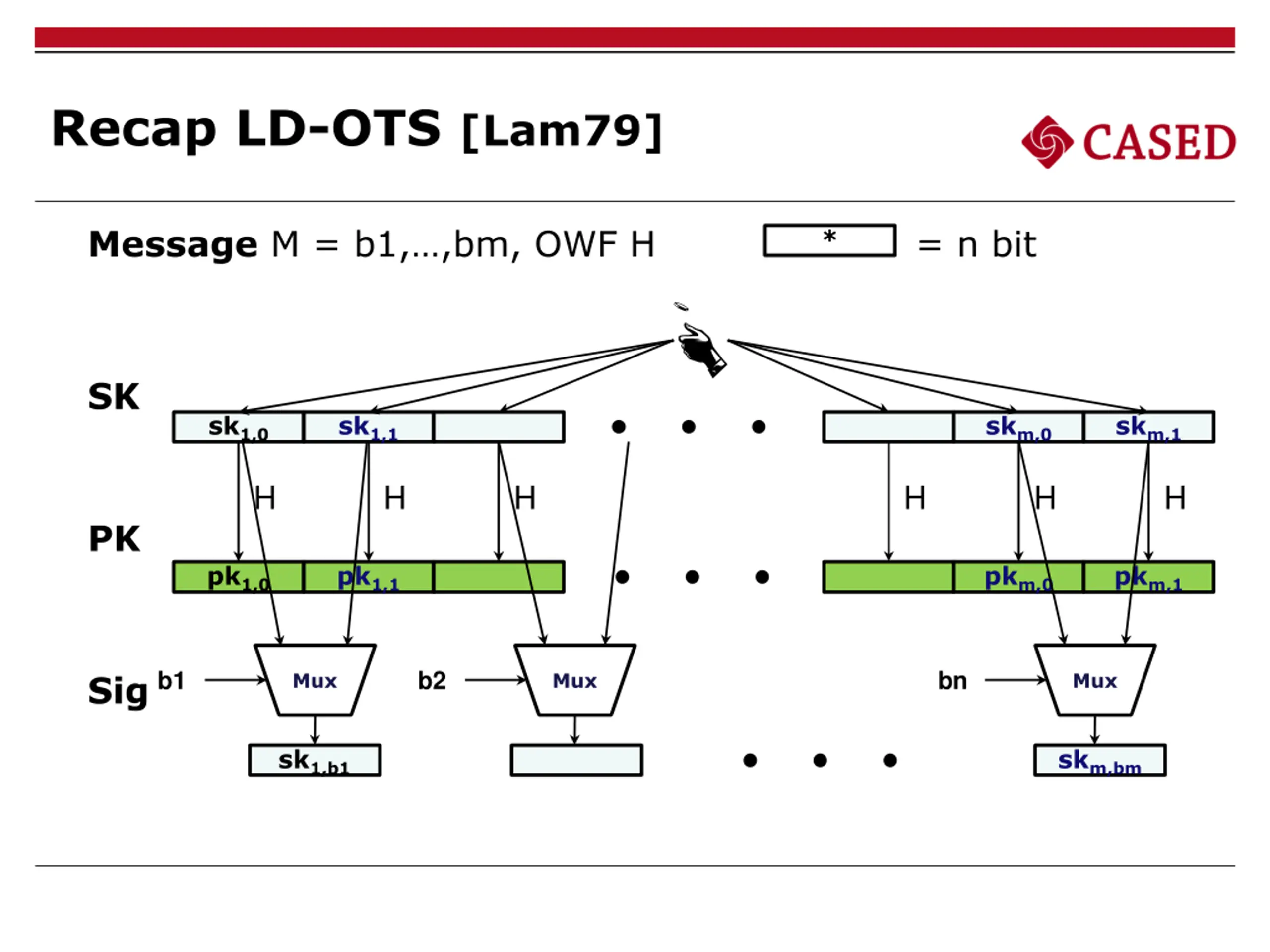 Recap LD-OTS [Lam79] Message M = b1, ,bm, OWF H = n bit * SK sk1,0 sk1,1 skm,0 skm,1 H H H H H H PK pk1,0 pk1,1 pkm,0 pkm,1 b1 b2 bn Sig Mux Mux Mux sk1,b1 skm,bm