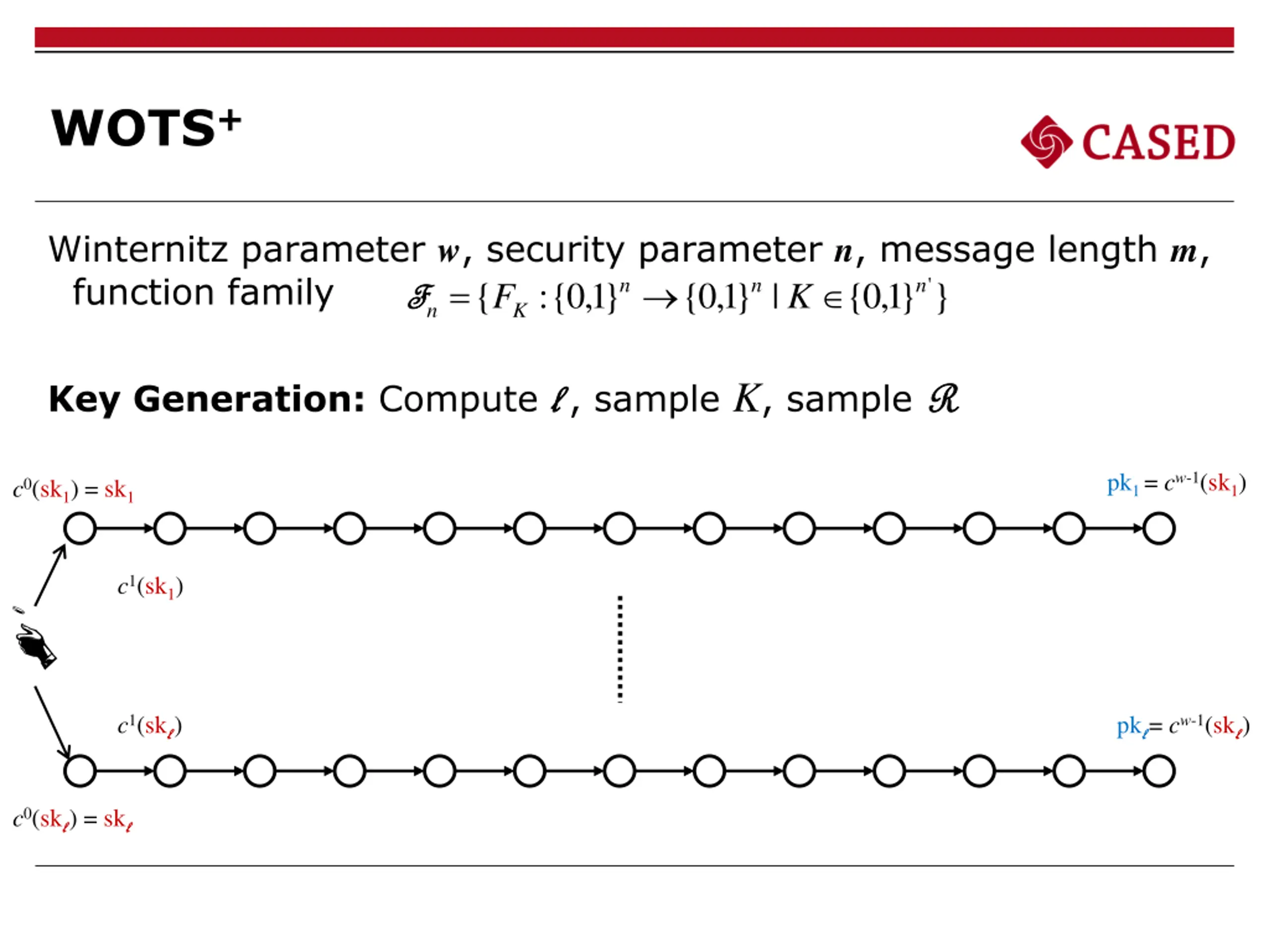 WOTS+ Winternitz parameter w, security parameter n, message length m, function family } 1 , 0 { : { K n F = F F ' n n n } 1 , 0 { | } 1 , 0 { } K Key Generation: Compute l l , sample K, sample R R pk1= cw-1(sk1) c0(sk1) = sk1 c1(sk1) c1(skll) pkll= cw-1(skll) c0(skll) = skll