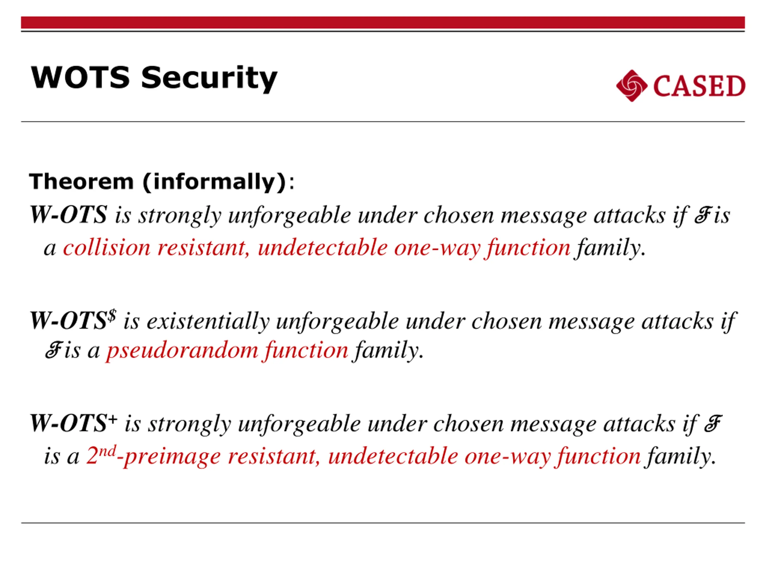 WOTS Security Theorem (informally): W-OTS is strongly unforgeable under chosen message attacks if F F is a collision resistant, undetectable one-way function family. W-OTS$is existentially unforgeable under chosen message attacks if F F is a pseudorandom function family. W-OTS+is strongly unforgeable under chosen message attacks if F F is a 2nd-preimage resistant, undetectable one-way function family.