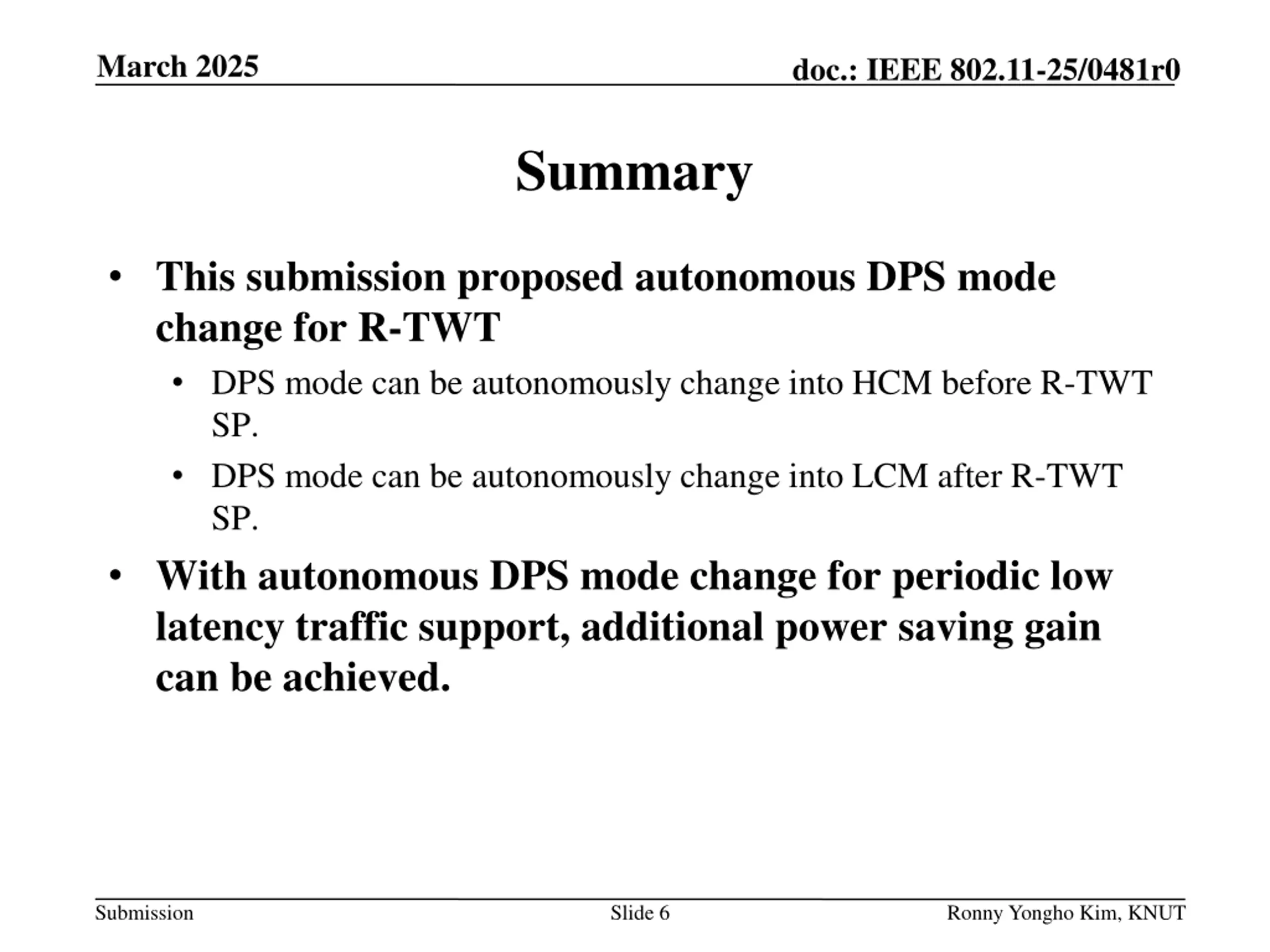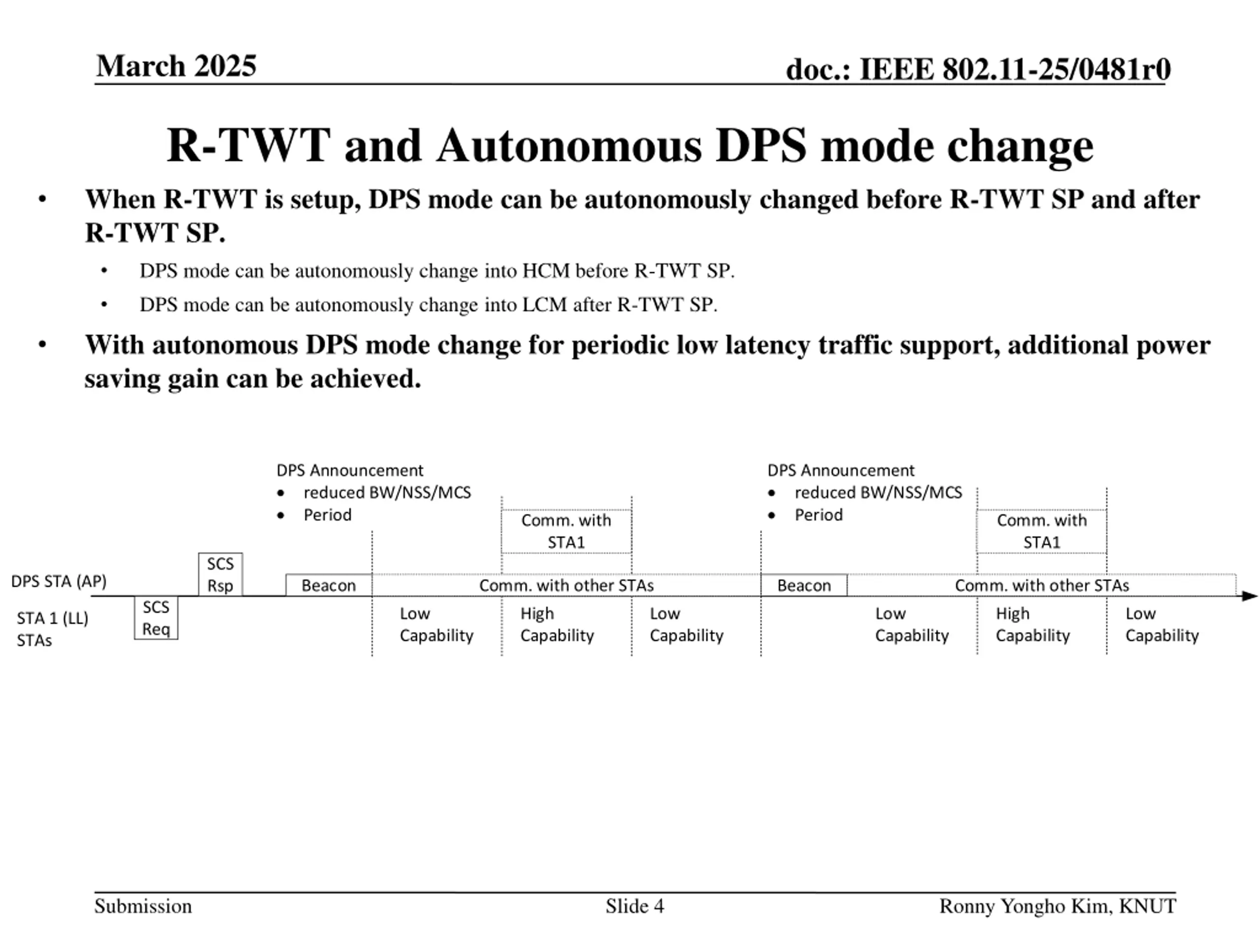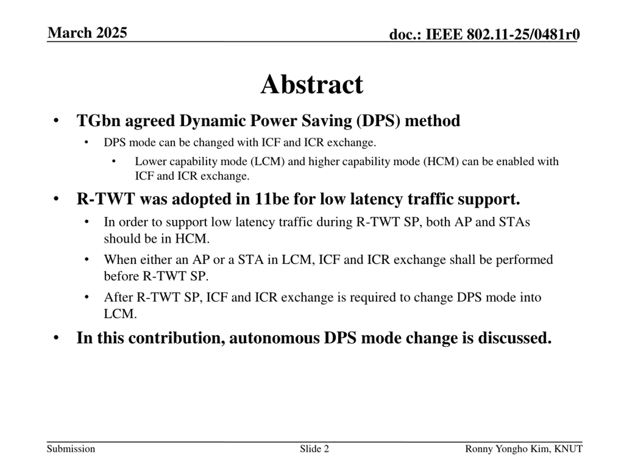 March 2025 doc.: IEEE 802.11-25/0481r0 Abstract TGbn agreed Dynamic Power Saving (DPS) method DPS mode can be changed with ICF and ICR exchange. Lower capability mode (LCM) and higher capability mode (HCM) can be enabled with ICF and ICR exchange. R-TWT was adopted in 11be for low latency traffic support. In order to support low latency traffic during R-TWT SP, both AP and STAs should be in HCM. When either an AP or a STA in LCM, ICF and ICR exchange shall be performed before R-TWT SP. After R-TWT SP, ICF and ICR exchange is required to change DPS mode into LCM. In this contribution, autonomous DPS mode change is discussed. Submission Slide 2 Ronny Yongho Kim, KNUT