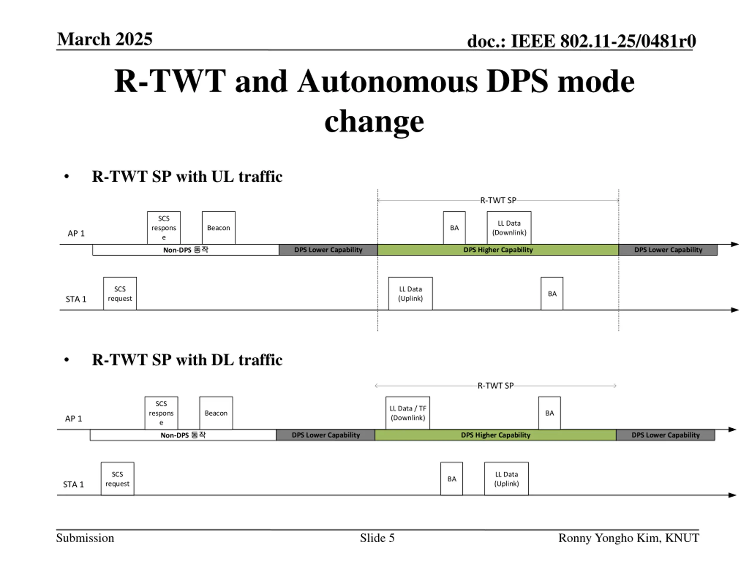March 2025 doc.: IEEE 802.11-25/0481r0 R-TWT and Autonomous DPS mode change R-TWT SP with UL traffic R-TWT SP SCS LL Data (Downlink) respons e Beacon BA AP 1 Non-DPS DPS Lower Capability DPS Higher Capability DPS Lower Capability SCS request LL Data (Uplink) BA STA 1 R-TWT SP with DL traffic R-TWT SP SCS LL Data / TF (Downlink) respons e Beacon BA AP 1 Non-DPS DPS Lower Capability DPS Higher Capability DPS Lower Capability SCS request LL Data (Uplink) BA STA 1 Submission Slide 5 Ronny Yongho Kim, KNUT