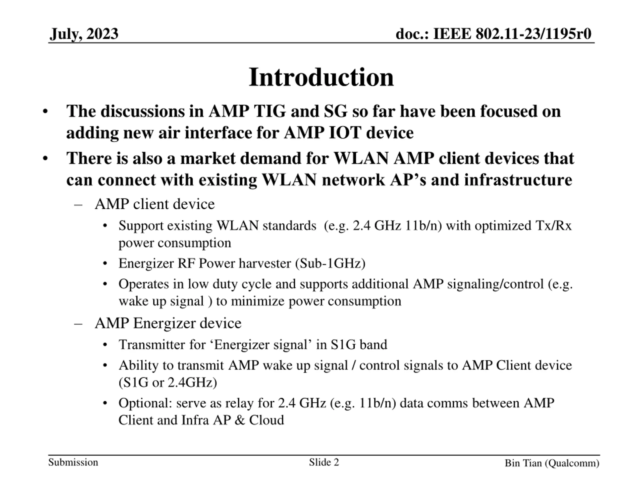 July, 2023 doc.: IEEE 802.11-23/1195r0 Introduction The discussions in AMP TIG and SG so far have been focused on adding new air interface for AMP IOT device There is also a market demand for WLAN AMP client devices that can connect with existing WLAN network AP s and infrastructure AMP client device Support existing WLAN standards (e.g. 2.4 GHz 11b/n) with optimized Tx/Rx power consumption Energizer RF Power harvester (Sub-1GHz) Operates in low duty cycle and supports additional AMP signaling/control (e.g. wake up signal ) to minimize power consumption AMP Energizer device Transmitter for Energizer signal in S1G band Ability to transmit AMP wake up signal / control signals to AMP Client device (S1G or 2.4GHz) Optional: serve as relay for 2.4 GHz (e.g. 11b/n) data comms between AMP Client and Infra AP & Cloud Submission Slide 2 Bin Tian (Qualcomm)