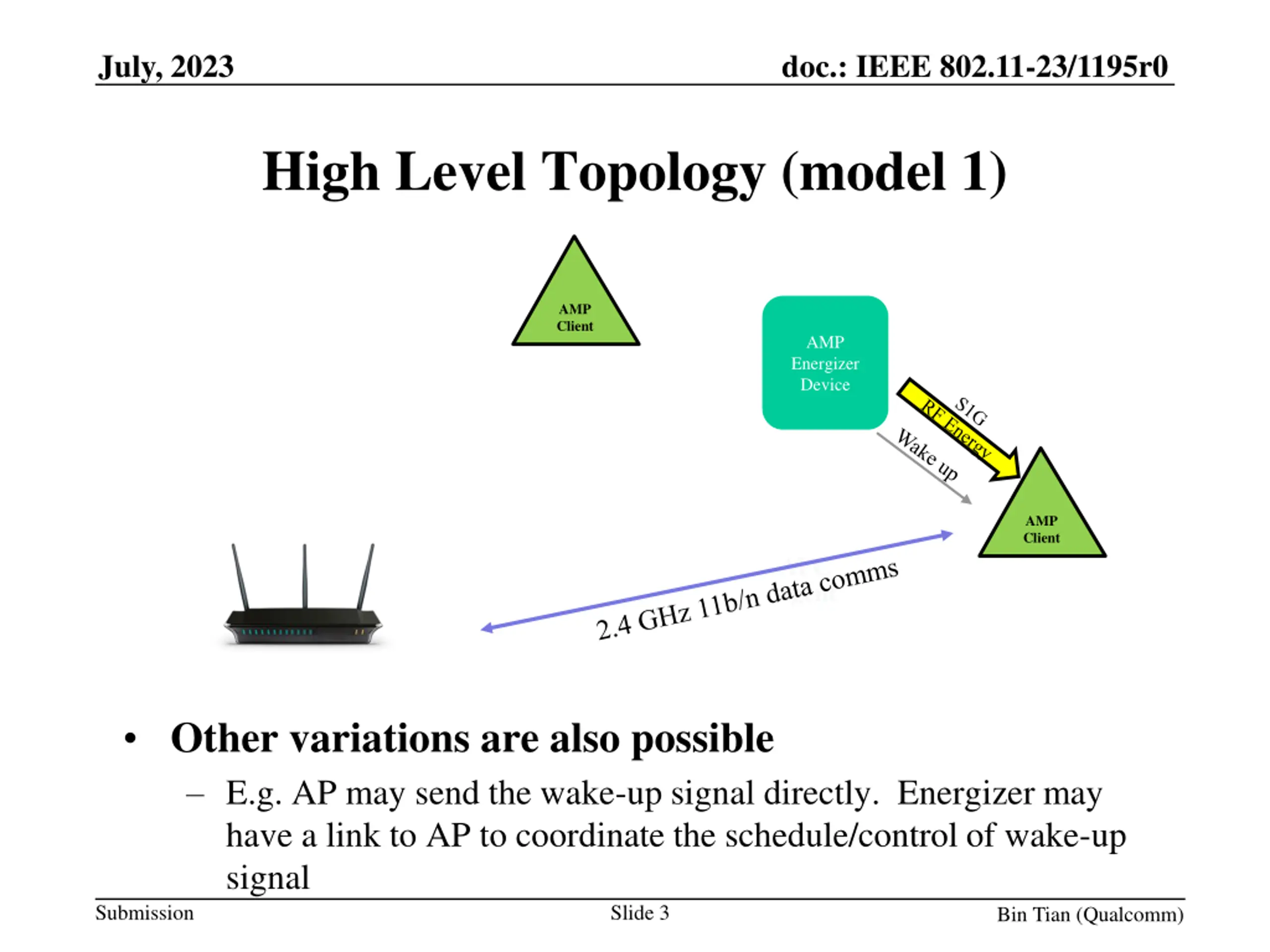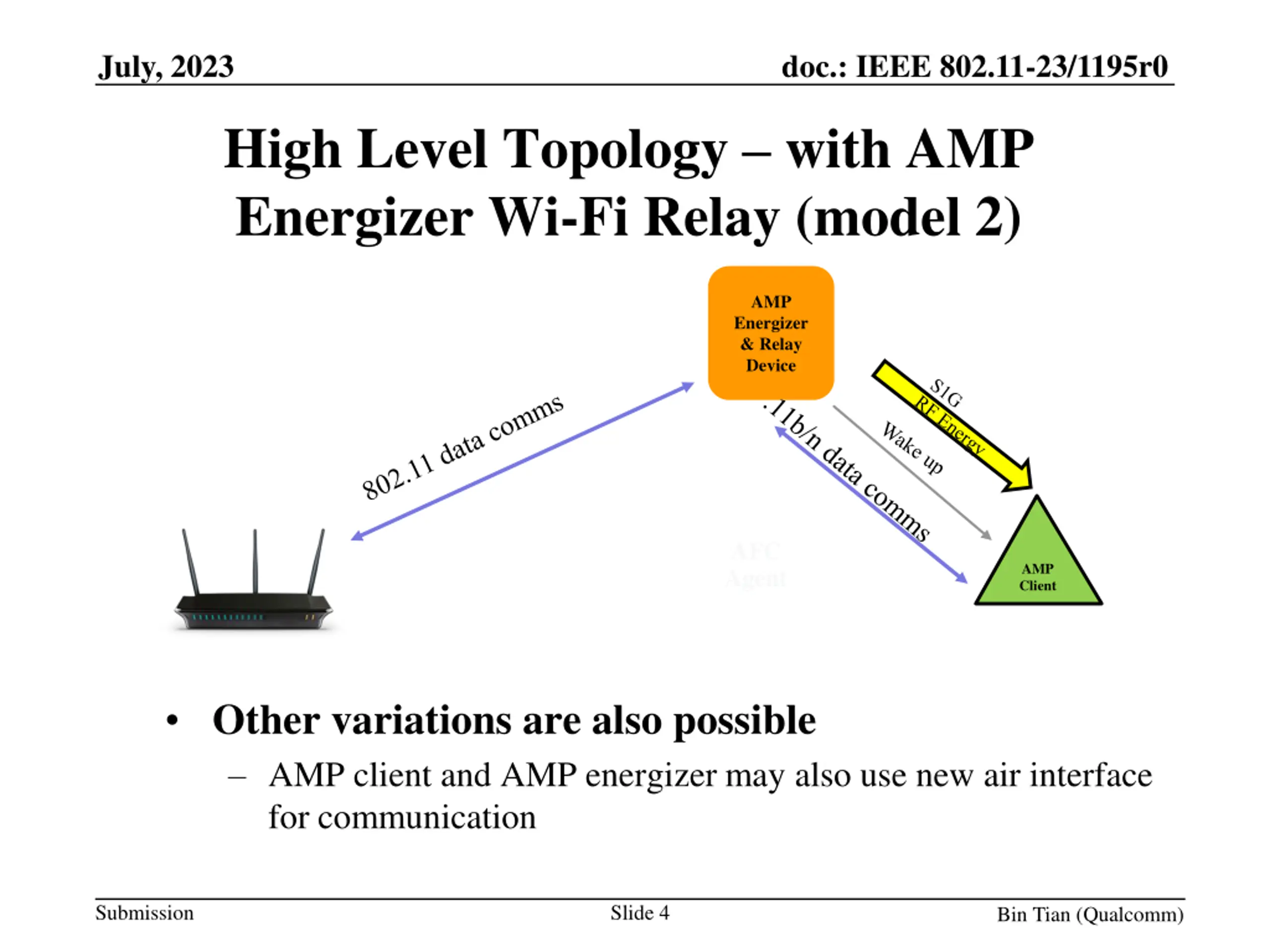 July, 2023 doc.: IEEE 802.11-23/1195r0 High Level Topology (model 1) AMP Client AMP Energizer Device AMP Client AFC Agent Other variations are also possible E.g. AP may send the wake-up signal directly. Energizer may have a link to AP to coordinate the schedule/control of wake-up signal Slide 3 Submission Bin Tian (Qualcomm)