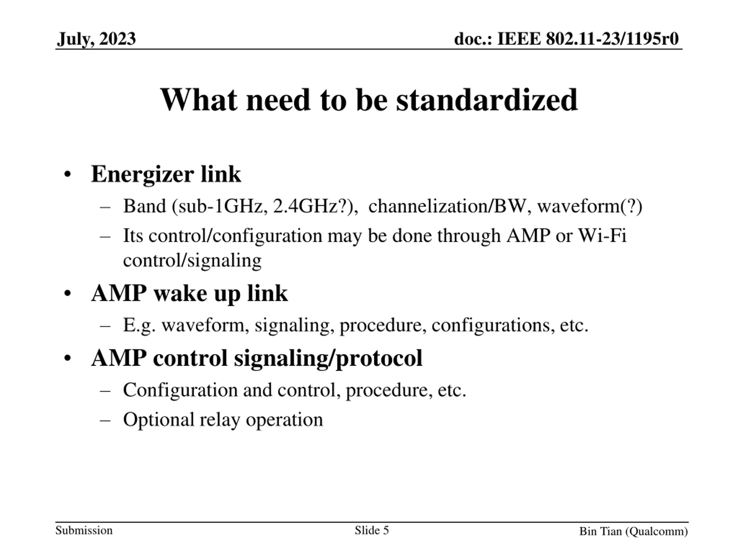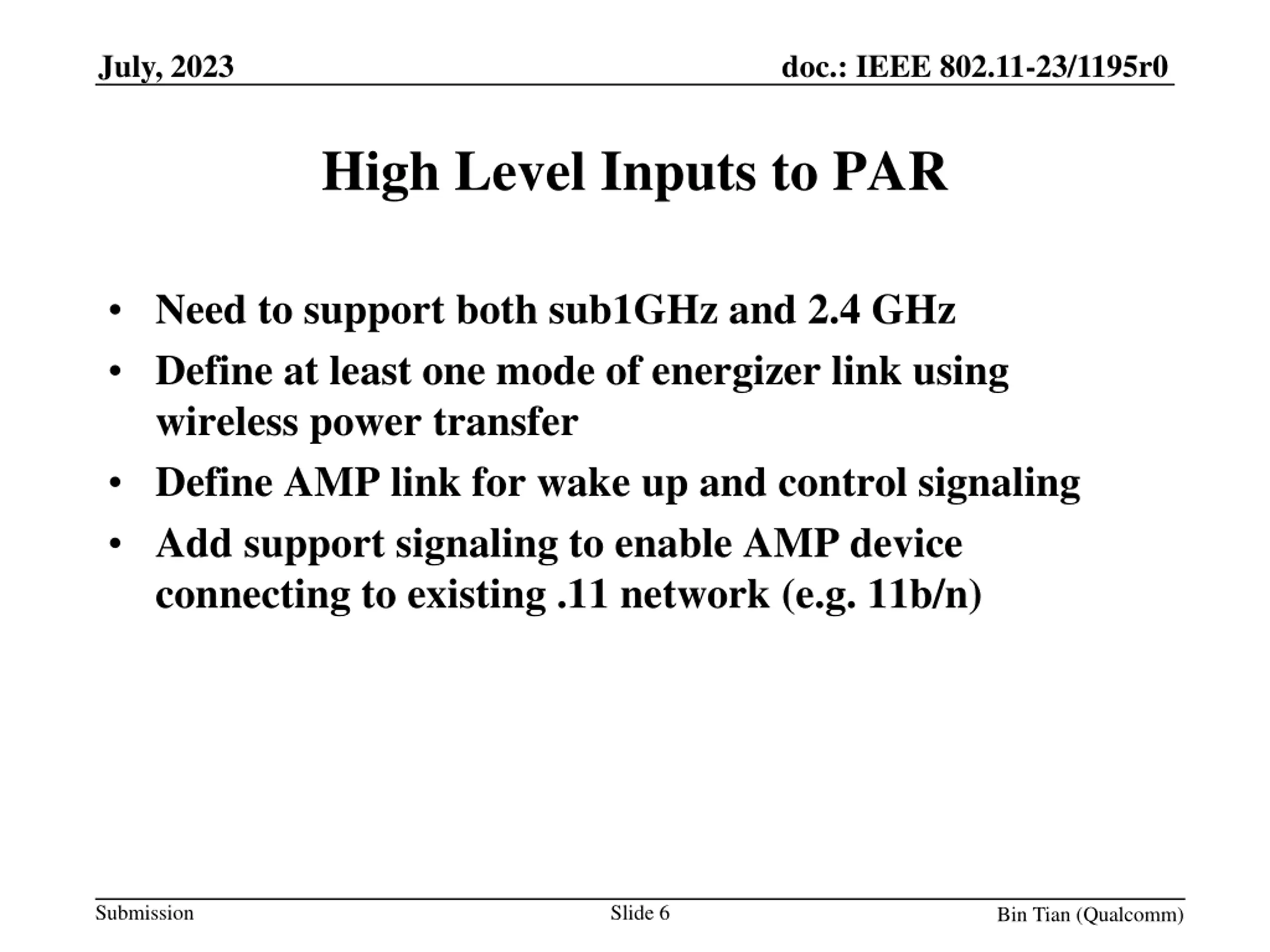 July, 2023 doc.: IEEE 802.11-23/1195r0 What need to be standardized Energizer link Band (sub-1GHz, 2.4GHz?), channelization/BW, waveform(?) Its control/configuration may be done through AMP or Wi-Fi control/signaling AMP wake up link E.g. waveform, signaling, procedure, configurations, etc. AMP control signaling/protocol Configuration and control, procedure, etc. Optional relay operation Submission Slide 5 Bin Tian (Qualcomm)
