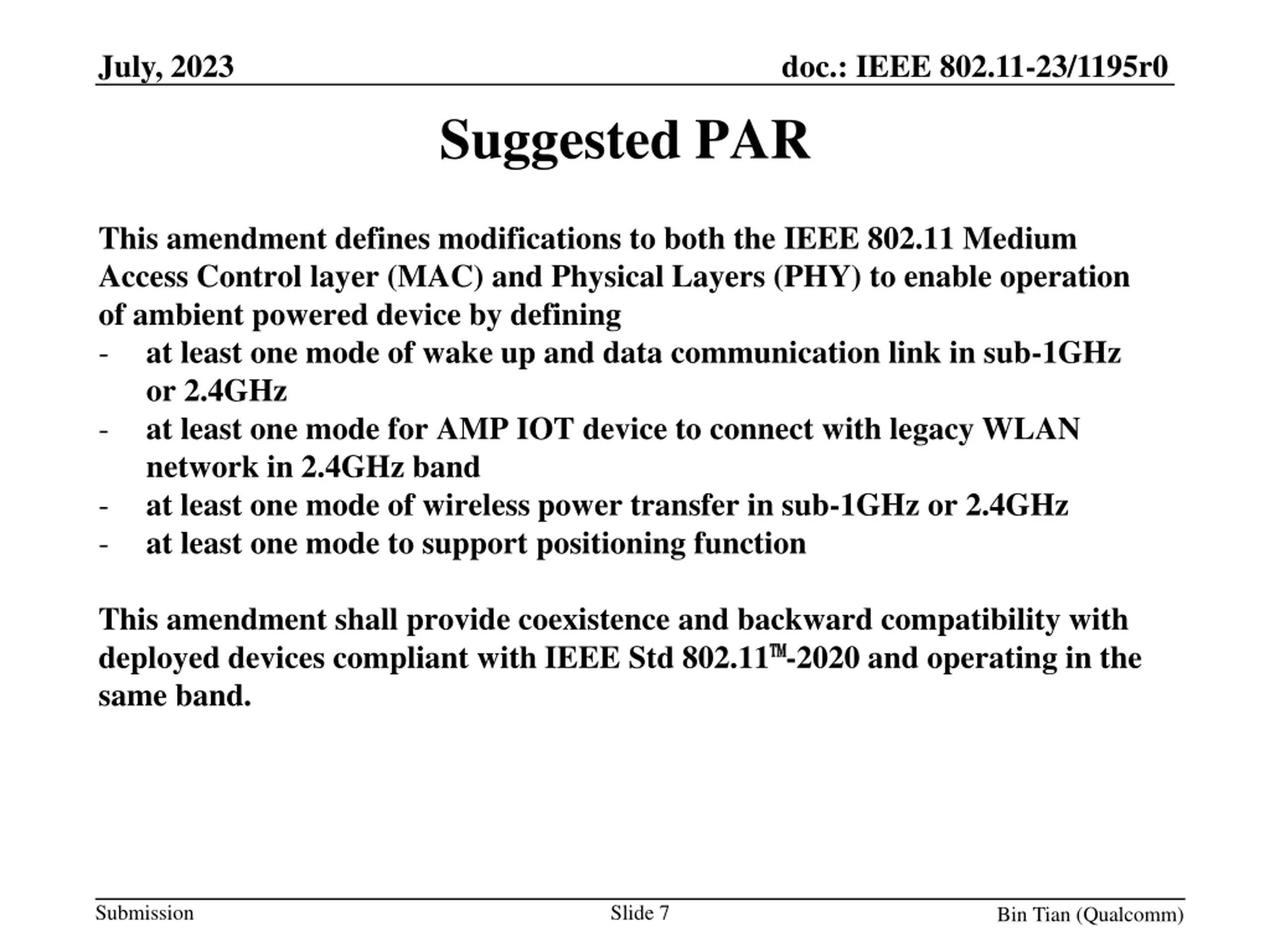 July, 2023 doc.: IEEE 802.11-23/1195r0 High Level Inputs to PAR Need to support both sub1GHz and 2.4 GHz Define at least one mode of energizer link using wireless power transfer Define AMP link for wake up and control signaling Add support signaling to enable AMP device connecting to existing .11 network (e.g. 11b/n) Submission Slide 6 Bin Tian (Qualcomm)