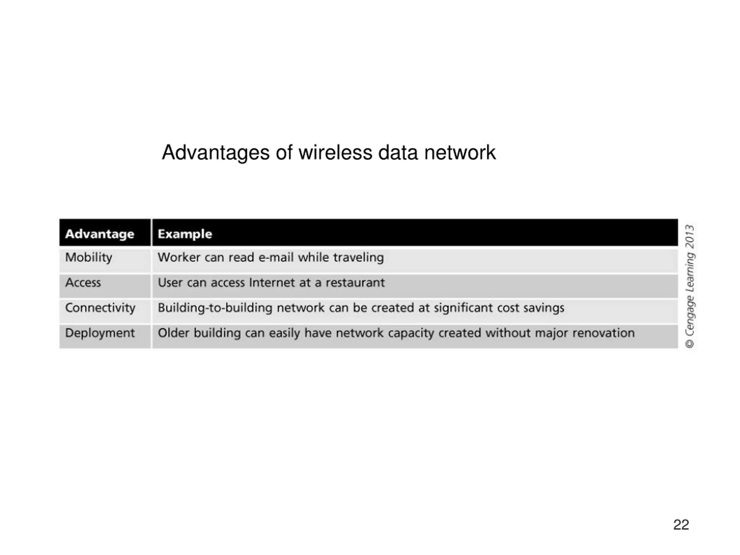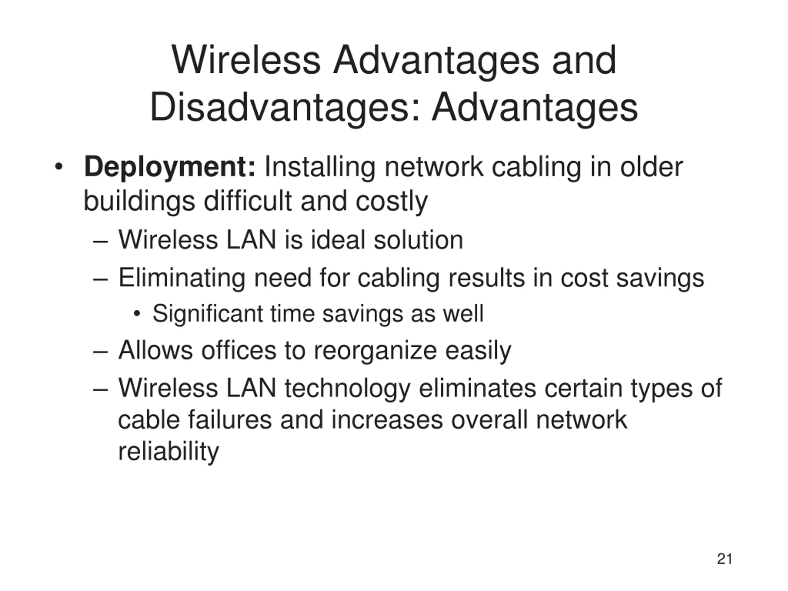 Wireless Advantages and Disadvantages: Advantages Deployment: Installing network cabling in older buildings difficult and costly Wireless LAN is ideal solution Eliminating need for cabling results in cost savings Significant time savings as well Allows offices to reorganize easily Wireless LAN technology eliminates certain types of cable failures and increases overall network reliability 21