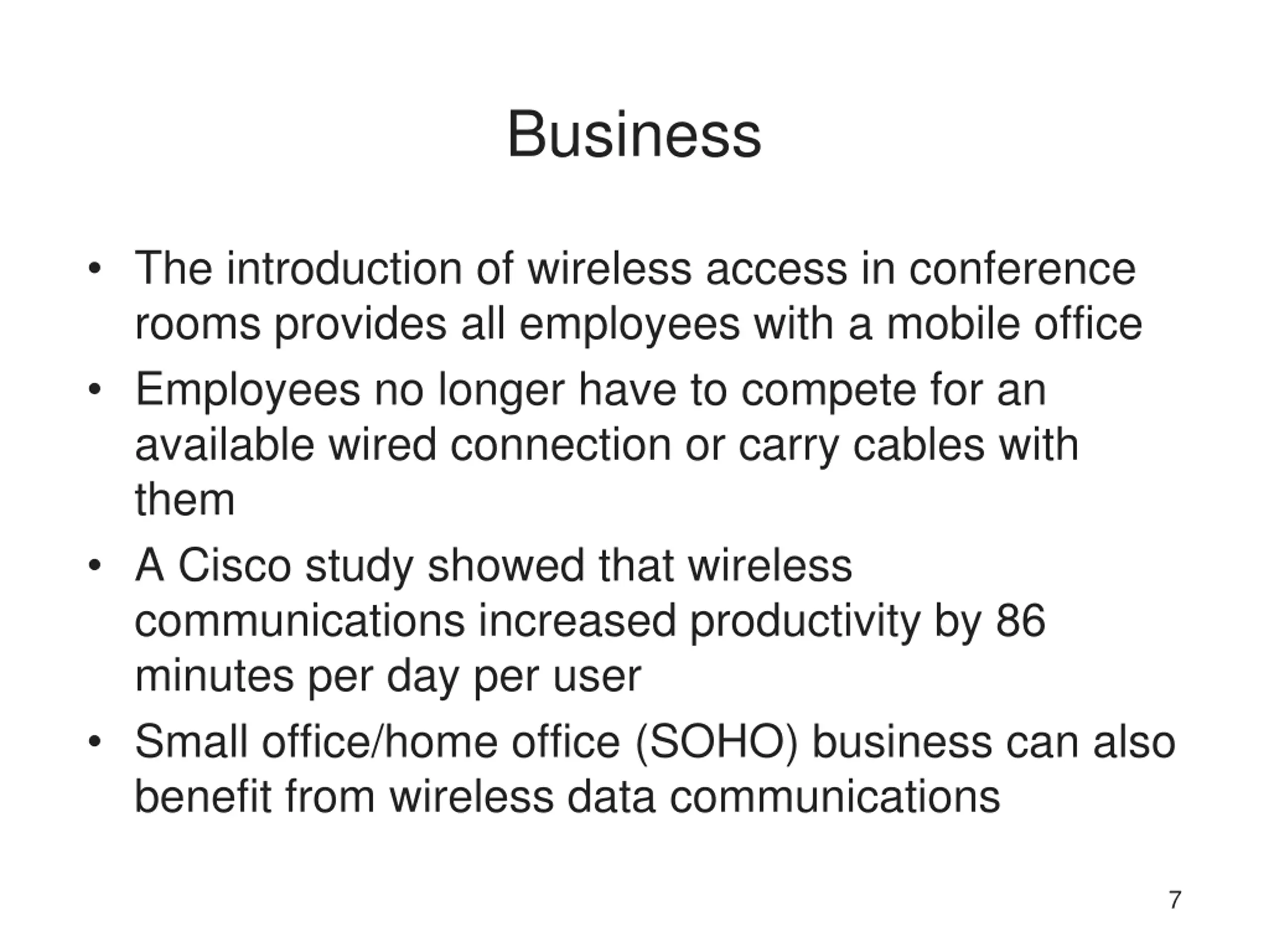 Business The introduction of wireless access in conference rooms provides all employees with a mobile office Employees no longer have to compete for an available wired connection or carry cables with them A Cisco study showed that wireless communications increased productivity by 86 minutes per day per user Small office/home office (SOHO) business can also benefit from wireless data communications 7
