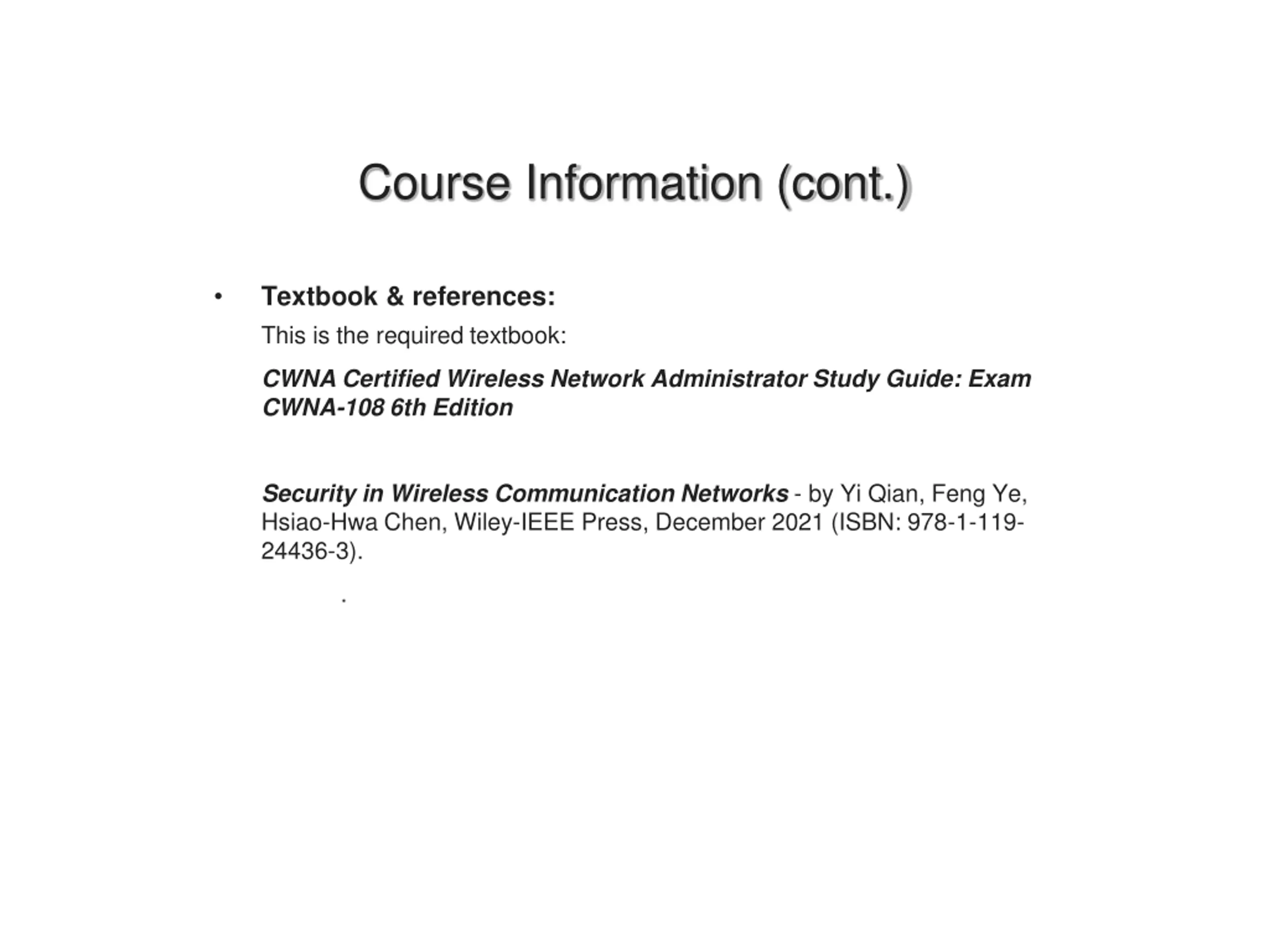 Course Information (cont.) Textbook & references: This is the required textbook: CWNA Certified Wireless Network Administrator Study Guide: Exam CWNA-108 6th Edition Security in Wireless Communication Networks - by Yi Qian, Feng Ye, Hsiao-Hwa Chen, Wiley-IEEE Press, December 2021 (ISBN: 978-1-119- 24436-3). .