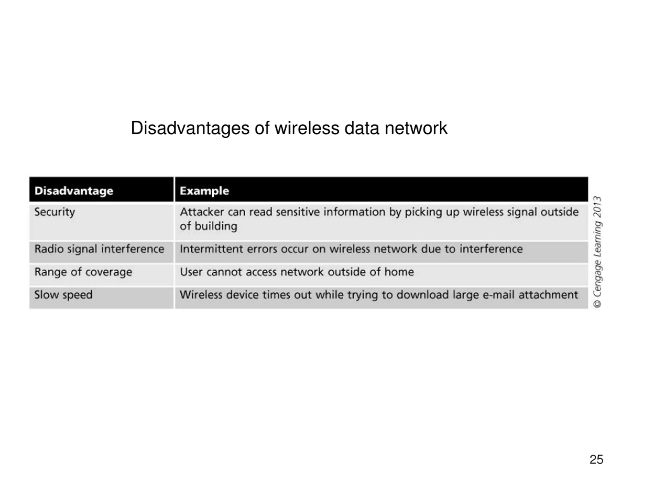 Wireless Advantages and Disadvantages: Disadvantages Radio Signal Interference: Signals from other devices can disrupt wireless transmissions e.g., Microwave ovens, elevator motors, photocopying machines, theft protection devices, cordless telephones Range of Coverage: Some wireless signals only have a range of 10 feet while others extend to over 350 feet Slow Speed: a packet moving through a wireless network is slower than it would be on a wired network 24