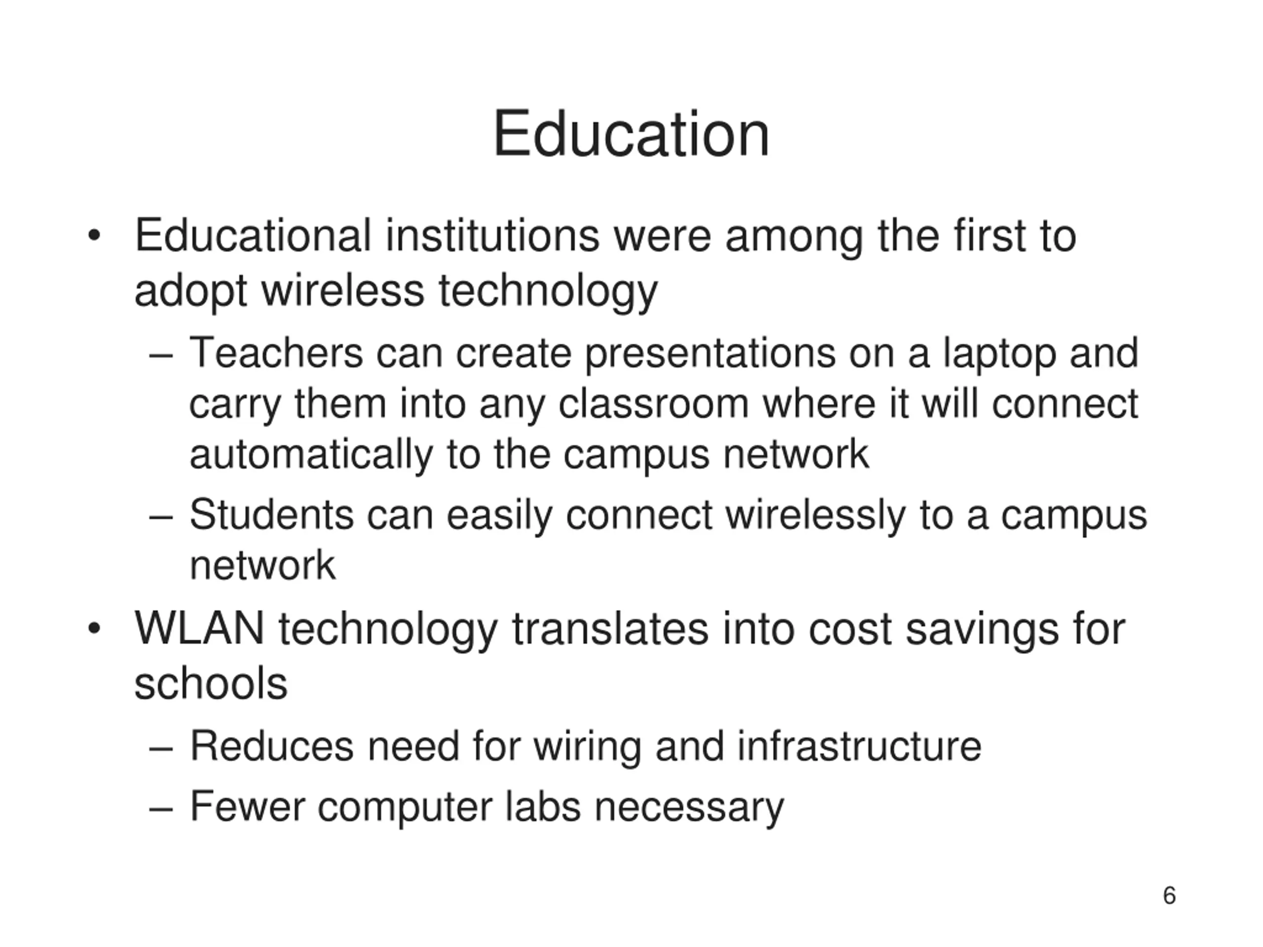 Education Educational institutions were among the first to adopt wireless technology Teachers can create presentations on a laptop and carry them into any classroom where it will connect automatically to the campus network Students can easily connect wirelessly to a campus network WLAN technology translates into cost savings for schools Reduces need for wiring and infrastructure Fewer computer labs necessary 6