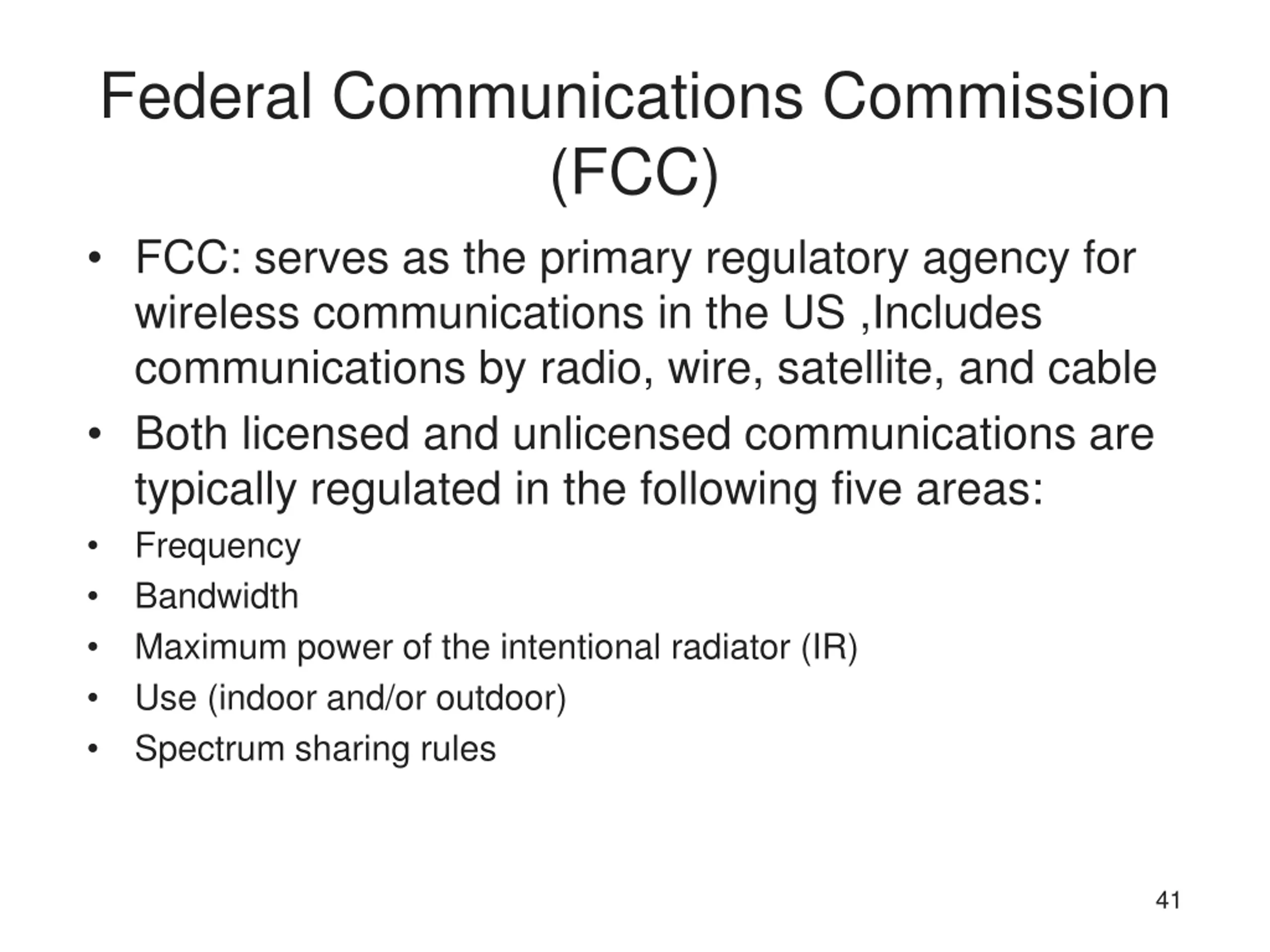 Federal Communications Commission (FCC) FCC: serves as the primary regulatory agency for wireless communications in the US ,Includes communications by radio, wire, satellite, and cable Both licensed and unlicensed communications are typically regulated in the following five areas: Frequency Bandwidth Maximum power of the intentional radiator (IR) Use (indoor and/or outdoor) Spectrum sharing rules 41