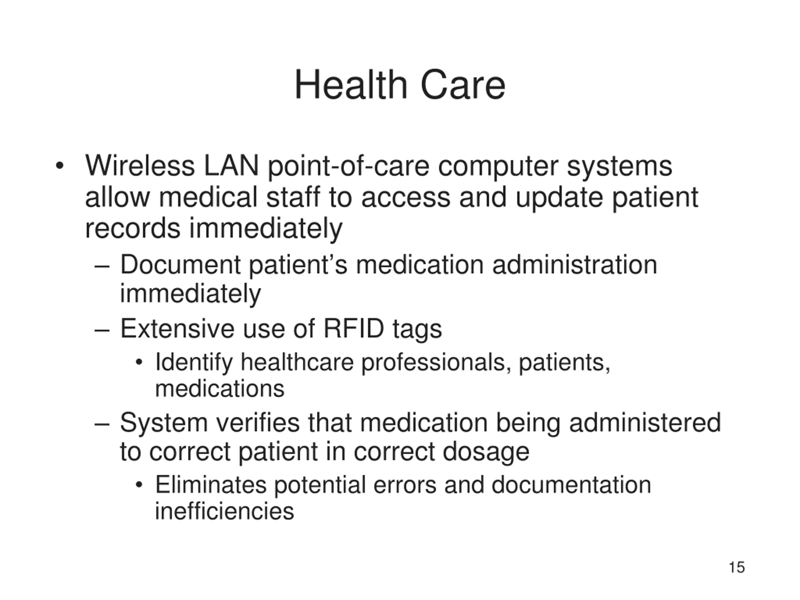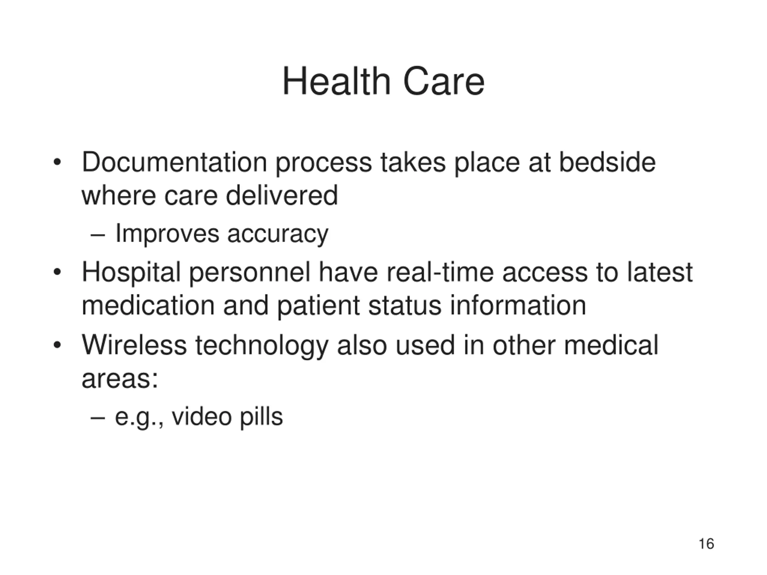 Health Care Wireless LAN point-of-care computer systems allow medical staff to access and update patient records immediately Document patient s medication administration immediately Extensive use of RFID tags Identify healthcare professionals, patients, medications System verifies that medication being administered to correct patient in correct dosage Eliminates potential errors and documentation inefficiencies 15