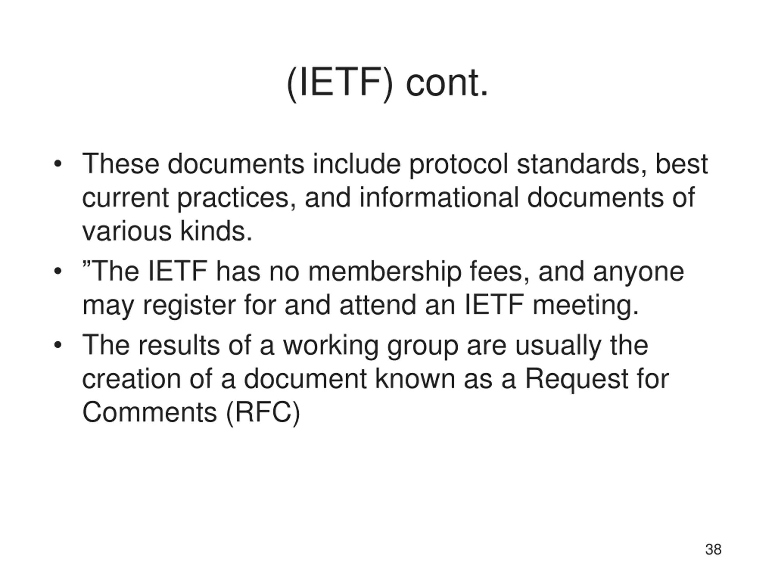 (IETF) cont. These documents include protocol standards, best current practices, and informational documents of various kinds. The IETF has no membership fees, and anyone may register for and attend an IETF meeting. The results of a working group are usually the creation of a document known as a Request for Comments (RFC) 38