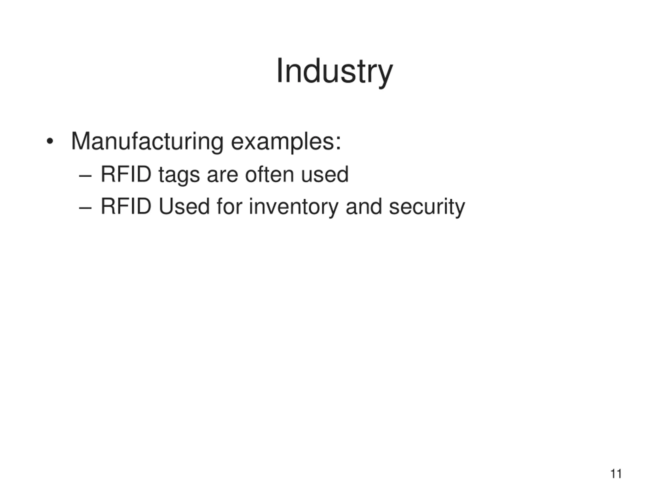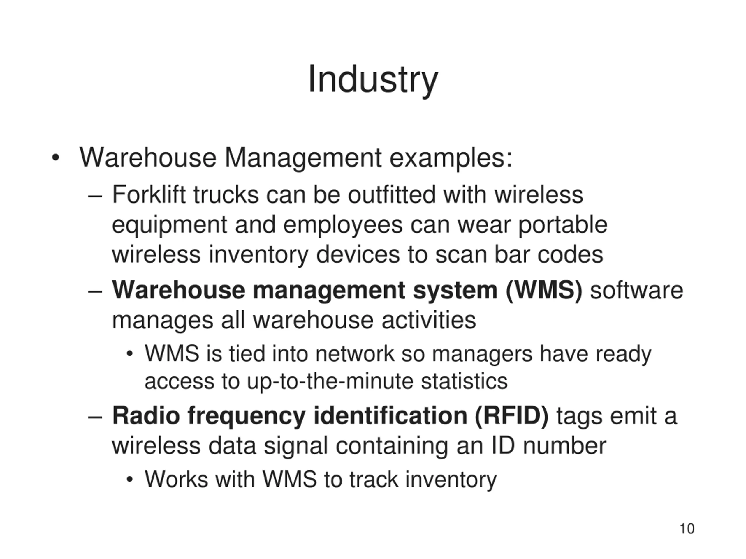 Industry Warehouse Management examples: Forklift trucks can be outfitted with wireless equipment and employees can wear portable wireless inventory devices to scan bar codes Warehouse management system (WMS) software manages all warehouse activities WMS is tied into network so managers have ready access to up-to-the-minute statistics Radio frequency identification (RFID) tags emit a wireless data signal containing an ID number Works with WMS to track inventory 10