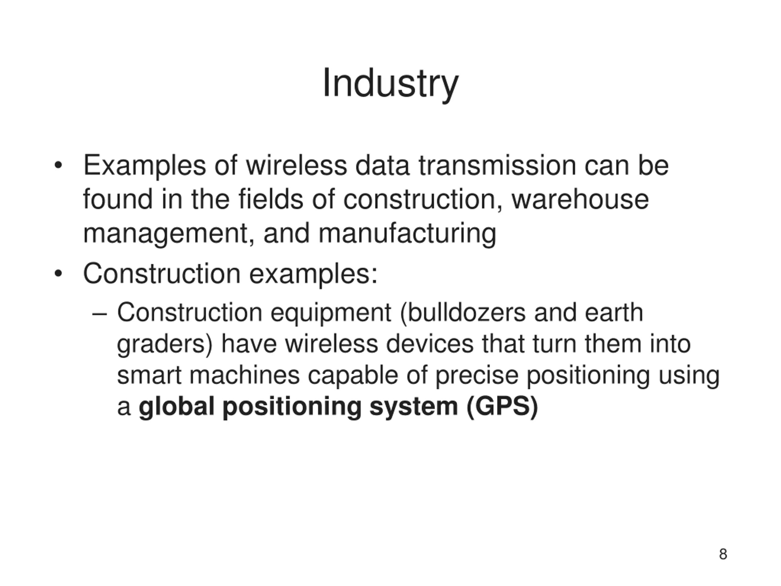 Industry Examples of wireless data transmission can be found in the fields of construction, warehouse management, and manufacturing Construction examples: Construction equipment (bulldozers and earth graders) have wireless devices that turn them into smart machines capable of precise positioning using a global positioning system (GPS) 8