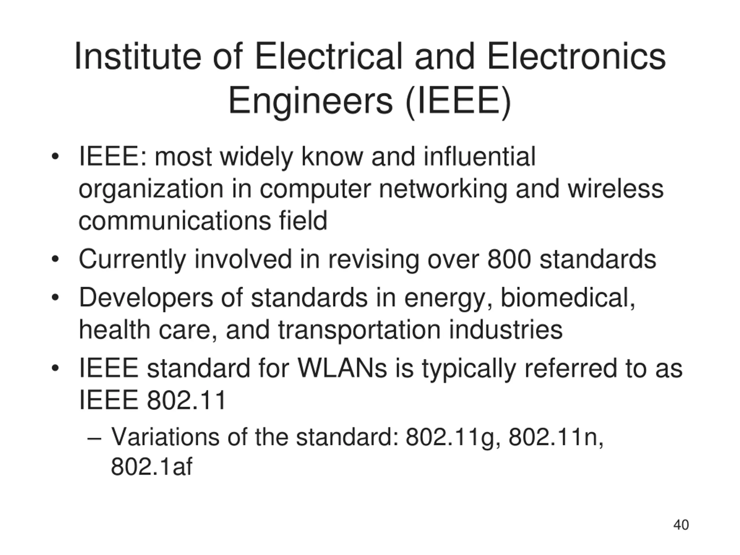 Institute of Electrical and Electronics Engineers (IEEE) IEEE: most widely know and influential organization in computer networking and wireless communications field Currently involved in revising over 800 standards Developers of standards in energy, biomedical, health care, and transportation industries IEEE standard for WLANs is typically referred to as IEEE 802.11 Variations of the standard: 802.11g, 802.11n, 802.1af 40
