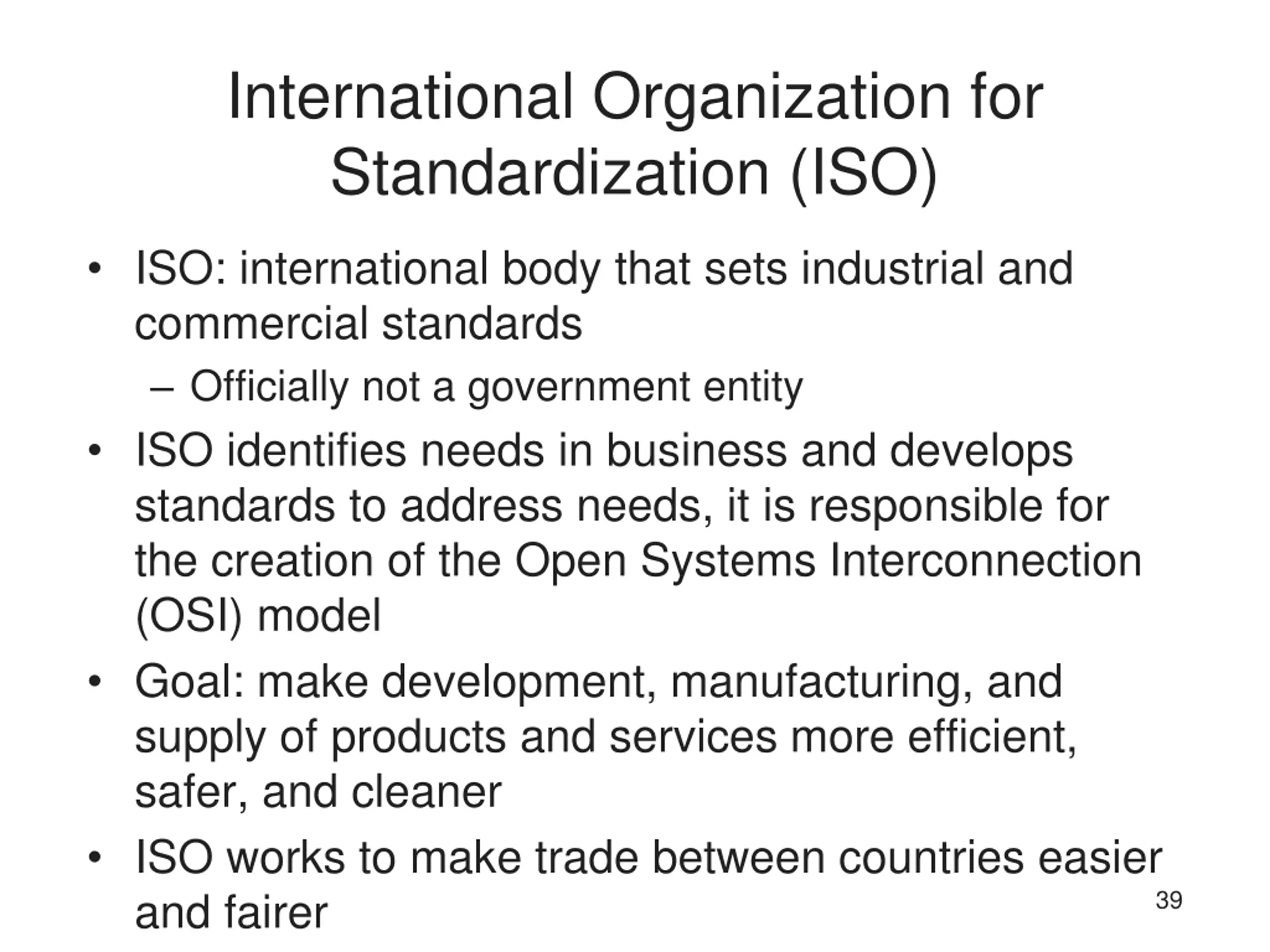 International Organization for Standardization (ISO) ISO: international body that sets industrial and commercial standards Officially not a government entity ISO identifies needs in business and develops standards to address needs, it is responsible for the creation of the Open Systems Interconnection (OSI) model Goal: make development, manufacturing, and supply of products and services more efficient, safer, and cleaner ISO works to make trade between countries easier and fairer 39