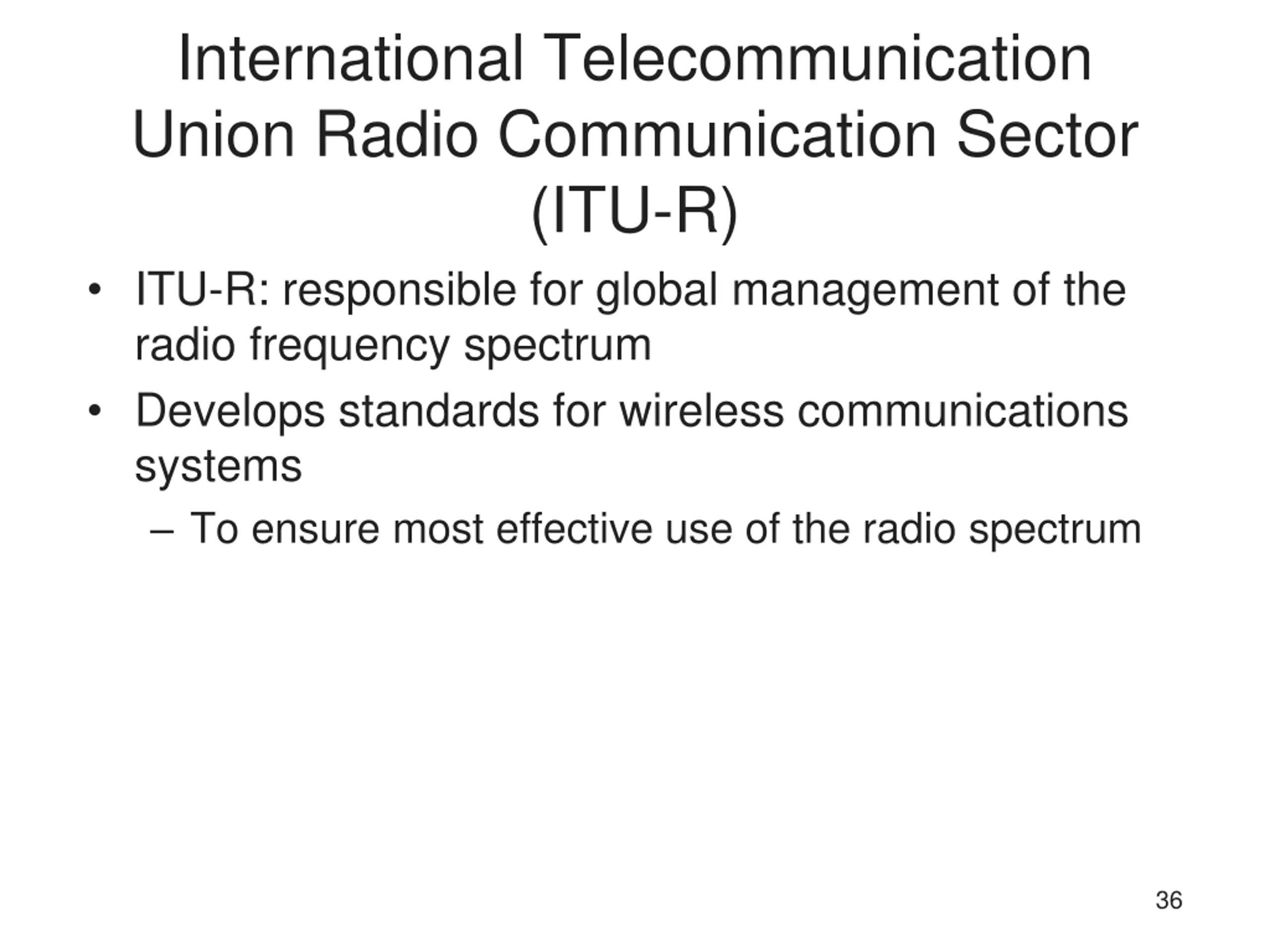 International Telecommunication Union Radio Communication Sector (ITU-R) ITU-R: responsible for global management of the radio frequency spectrum Develops standards for wireless communications systems To ensure most effective use of the radio spectrum 36