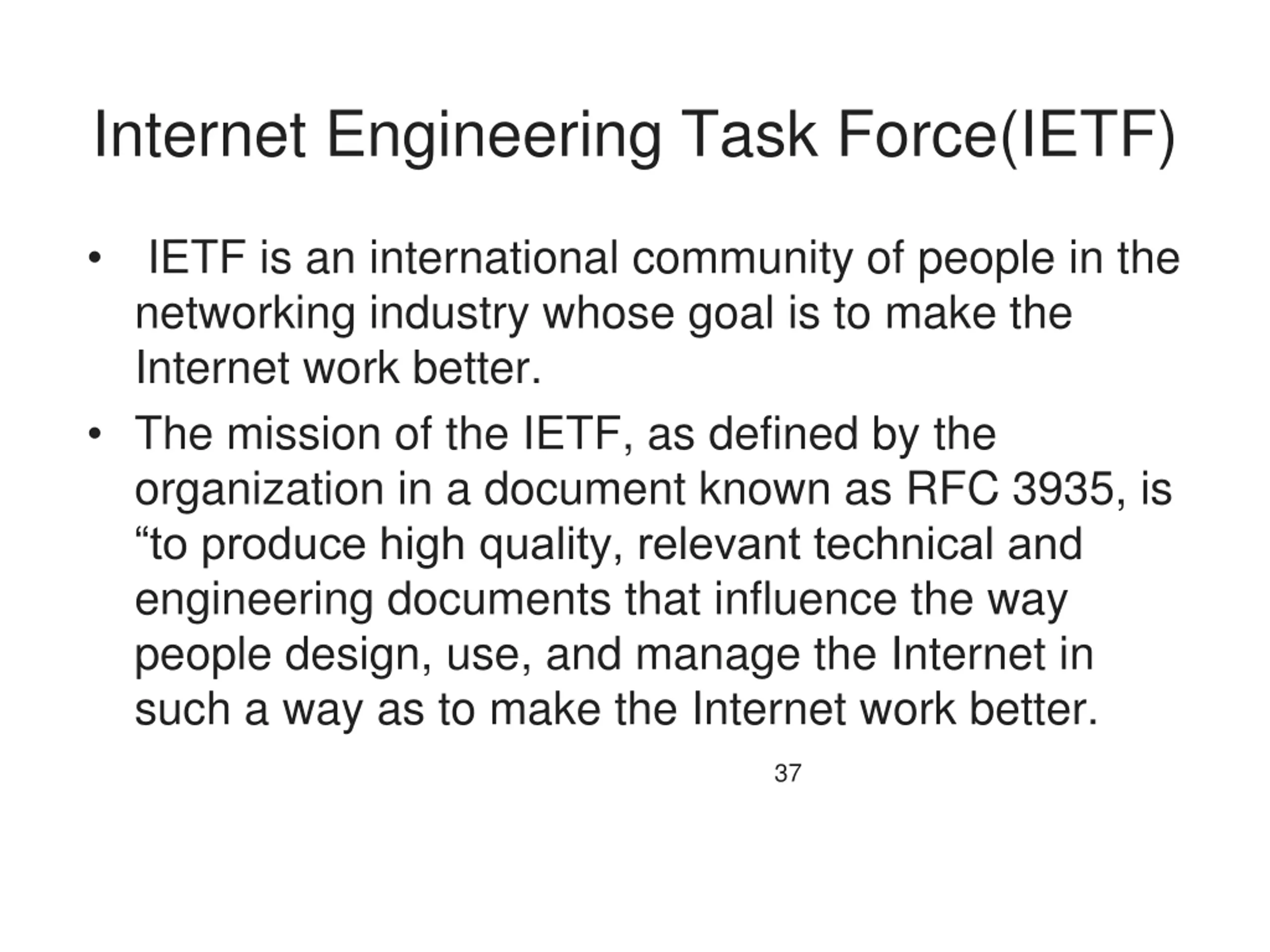 Internet Engineering Task Force(IETF) IETF is an international community of people in the networking industry whose goal is to make the Internet work better. The mission of the IETF, as defined by the organization in a document known as RFC 3935, is to produce high quality, relevant technical and engineering documents that influence the way people design, use, and manage the Internet in such a way as to make the Internet work better. 37