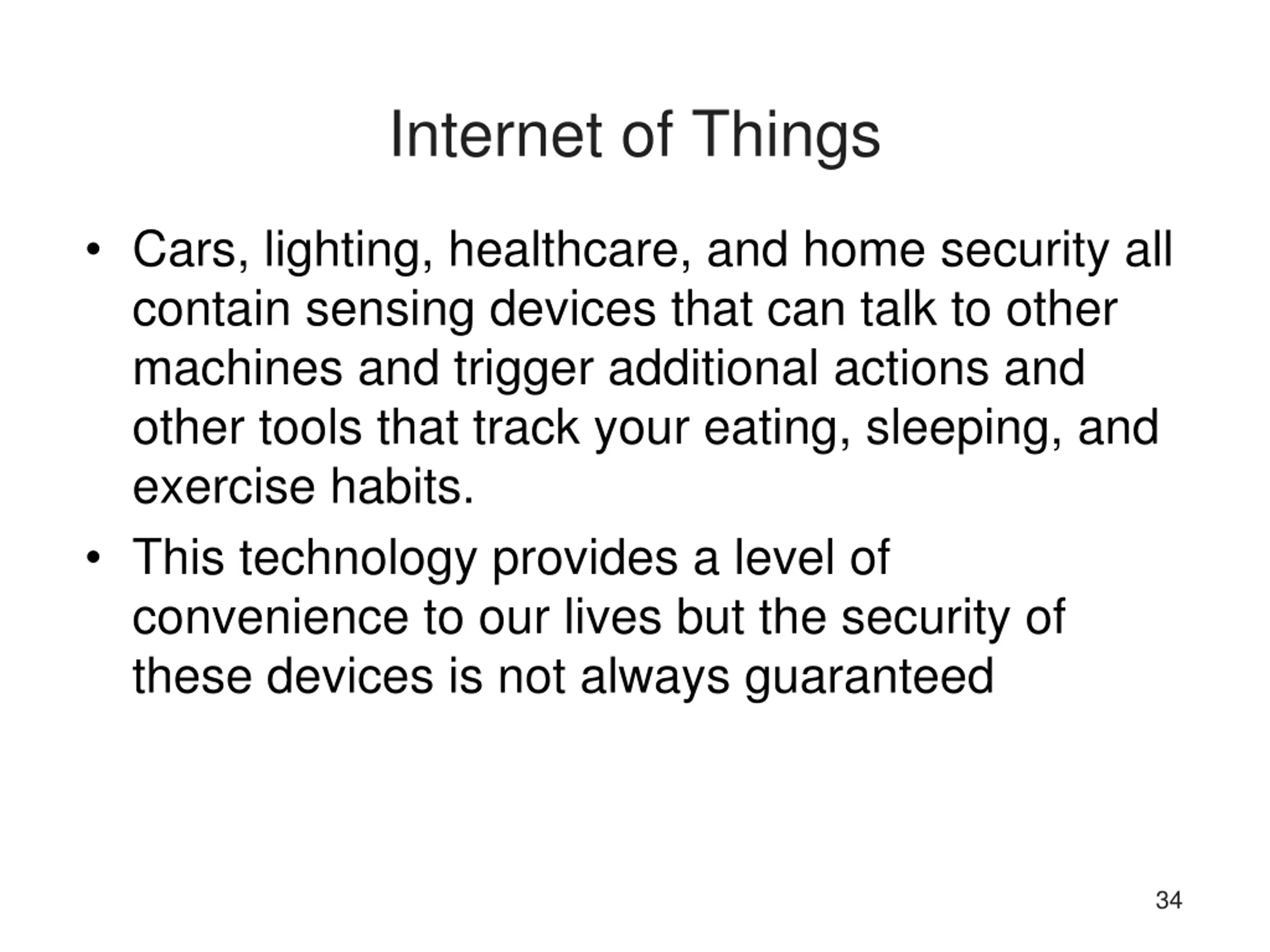 Internet of Things Cars, lighting, healthcare, and home security all contain sensing devices that can talk to other machines and trigger additional actions and other tools that track your eating, sleeping, and exercise habits. This technology provides a level of convenience to our lives but the security of these devices is not always guaranteed 34