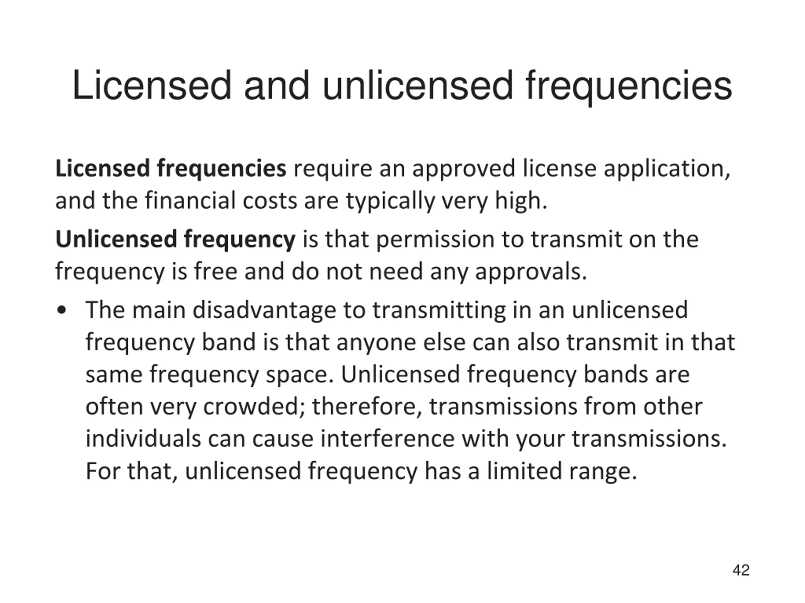 Licensed and unlicensed frequencies Licensed frequencies require an approved license application, and the financial costs are typically very high. Unlicensed frequency is that permission to transmit on the frequency is free and do not need any approvals. The main disadvantage to transmitting in an unlicensed frequency band is that anyone else can also transmit in that same frequency space. Unlicensed frequency bands are often very crowded; therefore, transmissions from other individuals can cause interference with your transmissions. For that, unlicensed frequency has a limited range. 42